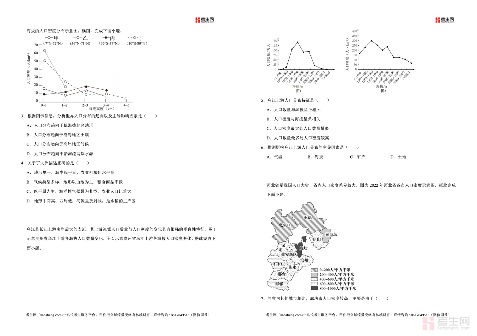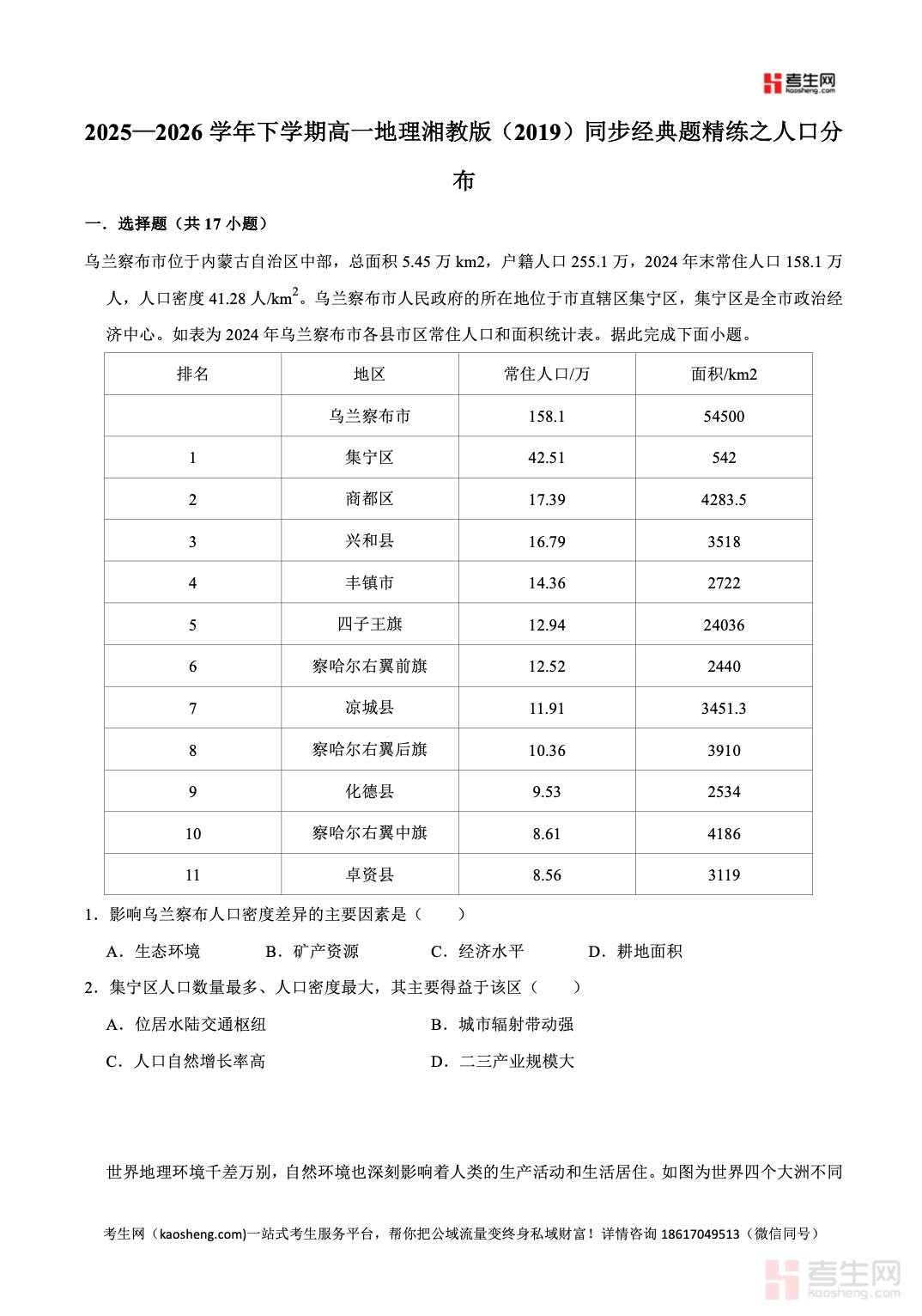 2025—2026 学年下学期高一地理湘教版(2019)同步经典题精练之人口分布,同步教材教学进度,围绕世界人口分布特征、我国人口分布格局、自然与人文影响因素、人口分布与地理环境的关系等核心考点精选习题,题型包含基础选择、图表判读、材料分析与综合简答,侧重读图析图、区域对比、逻辑推理、答题规范训练,紧密贴合新课标与高考命题思路。习题难度梯度合理,考点覆盖全面,可有效帮助学生巩固课堂知识、辨析易错概念。适合高一学生课后同步练习、章节复习、专题巩固、考前自测,提升人口地理相关内容的理解与综合解题能力。请添加微信 18617049513 进专属群,获取更多免费资源!