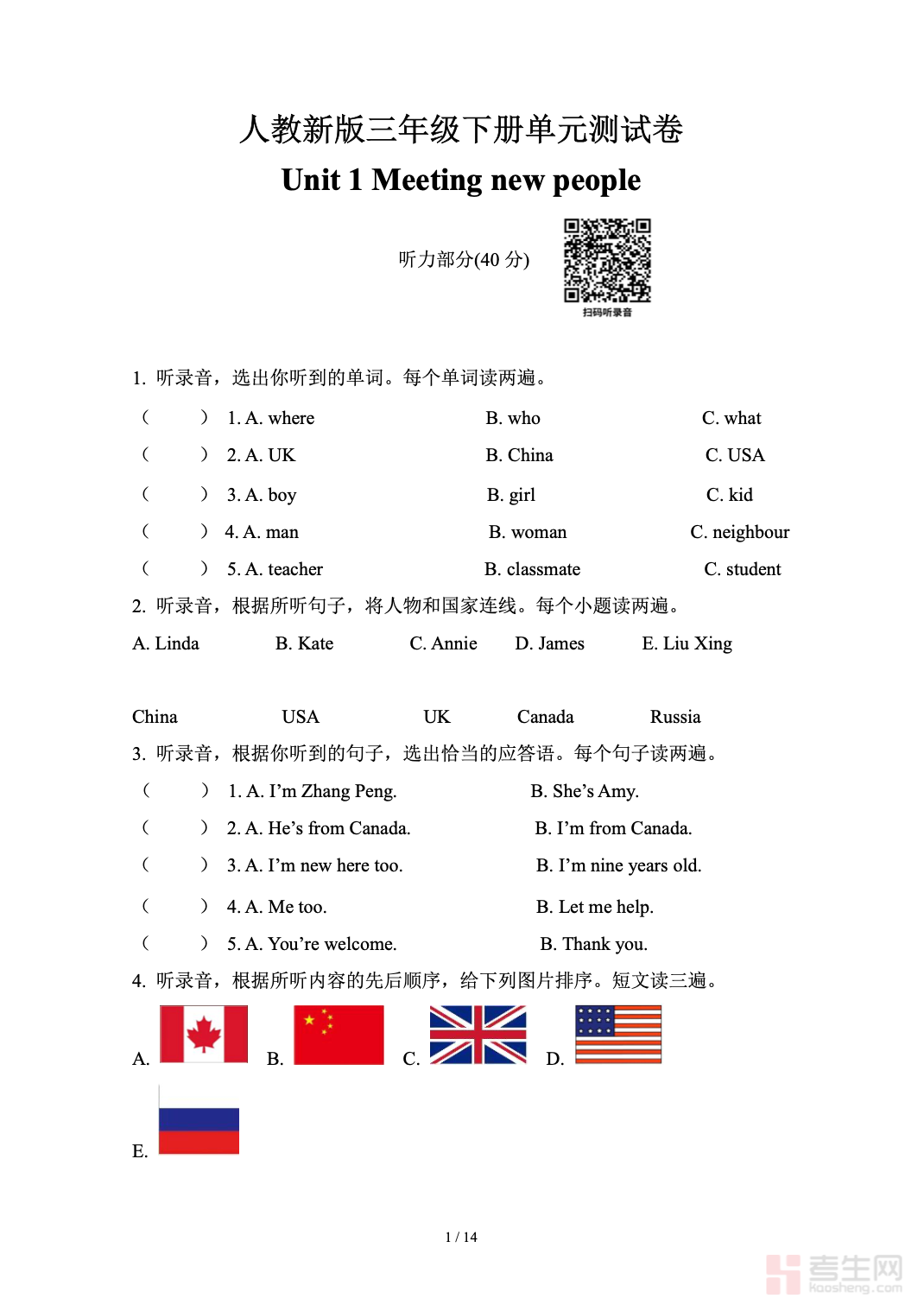 小学英语第一单元测试卷三年级下册紧扣教材第一单元教学内容,全面覆盖基础单词、重点句型、日常交际对话、简单语法应用等核心考点,题型设计贴合三年级学情,包含听力判断、单项选择、英汉互译、单词书写、情景匹配、连词成句等,注重基础知识巩固、听力能力提升、规范书写训练、语言实际运用,难度适中且考点分布合理。试卷可用于学生单元自测、课堂检测、课后复习、家长辅导验收,帮助孩子及时查漏补缺,夯实新学期英语起步基础,提升单元学习效果与应试能力。请添加微信 18617049513 进专属群,获取更多免费资源!