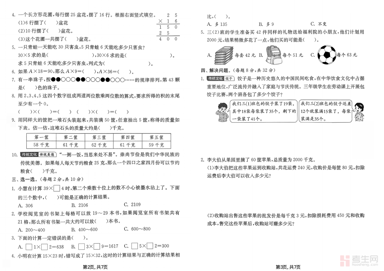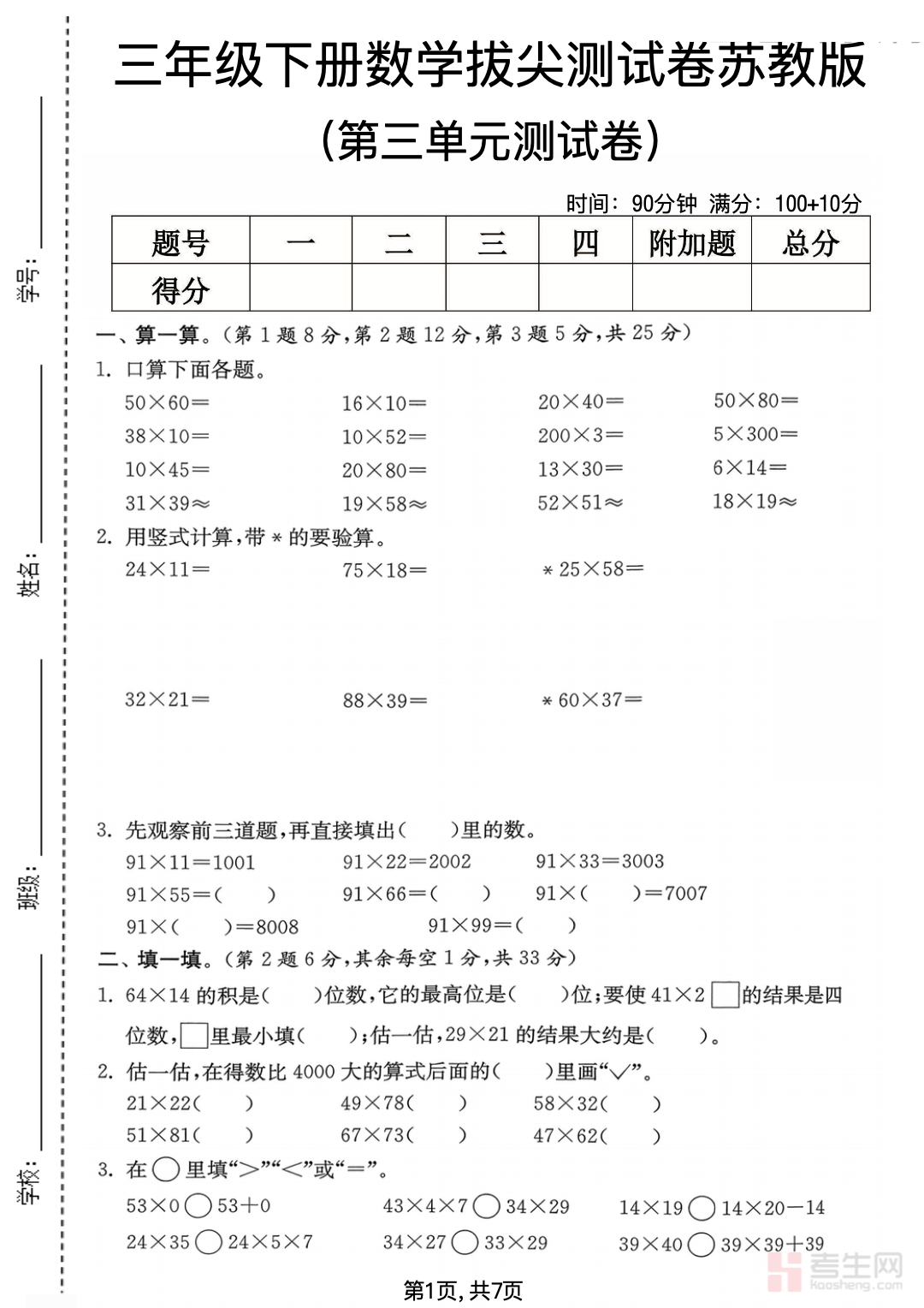 小学数学第三单元检测卷(苏教版)(三年级下)严格对照苏教版三年级下册数学第三单元教学内容,全面考查两位数乘两位数的口算、估算、笔算、乘数末尾有 0 的简便计算、两步连乘实际问题等核心知识点,题型涵盖填空、判断、选择、竖式计算和解决问题,注重训练计算准确性、运算顺序规范、题意理解、实际问题列式解答能力,难度贴合三年级学情与单元测试标准。试卷结构清晰、考点分布均衡,适合三年级学生单元自测、课堂练习、课后巩固、查漏补缺,快速巩固本单元知识,提升数学运算与应用能力。请添加微信 18617049513 进专属群,获取更多免费资源!