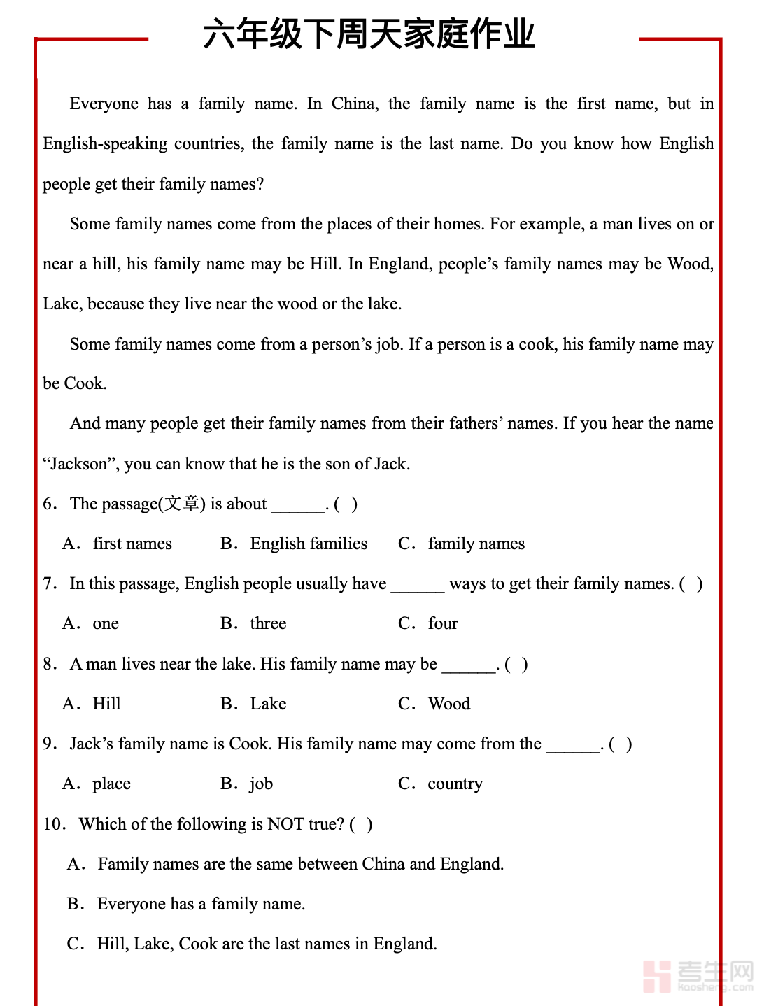 小学英语周末家庭作业(六年级下)紧扣六年级下册英语教材重难点,贴合小升初英语备考要求,全面覆盖核心单词、重点句型、时态运用、情景对话、阅读理解与书面表达等必考内容,题型包含单词拼写、单项选择、句型转换、完形填空、短文阅读及小作文等,注重强化词汇记忆、语法运用、答题规范、阅读理解与写作表达能力,难度适中且与课堂教学同步。作业设计循序渐进,适合六年级学生周末巩固、知识梳理、查漏补缺、提升应试技巧,有效巩固一周所学内容,夯实英语基础,为小升初备考做好充分准备。请添加微信 18617049513 进专属群,获取更多免费资源!