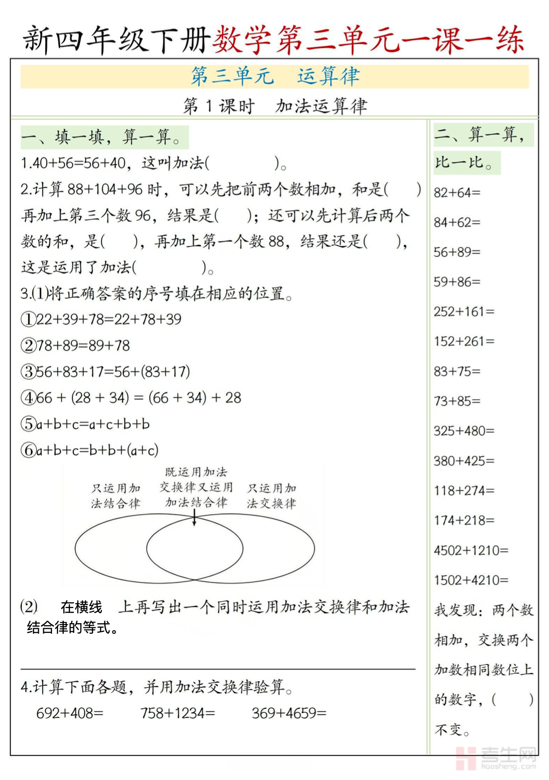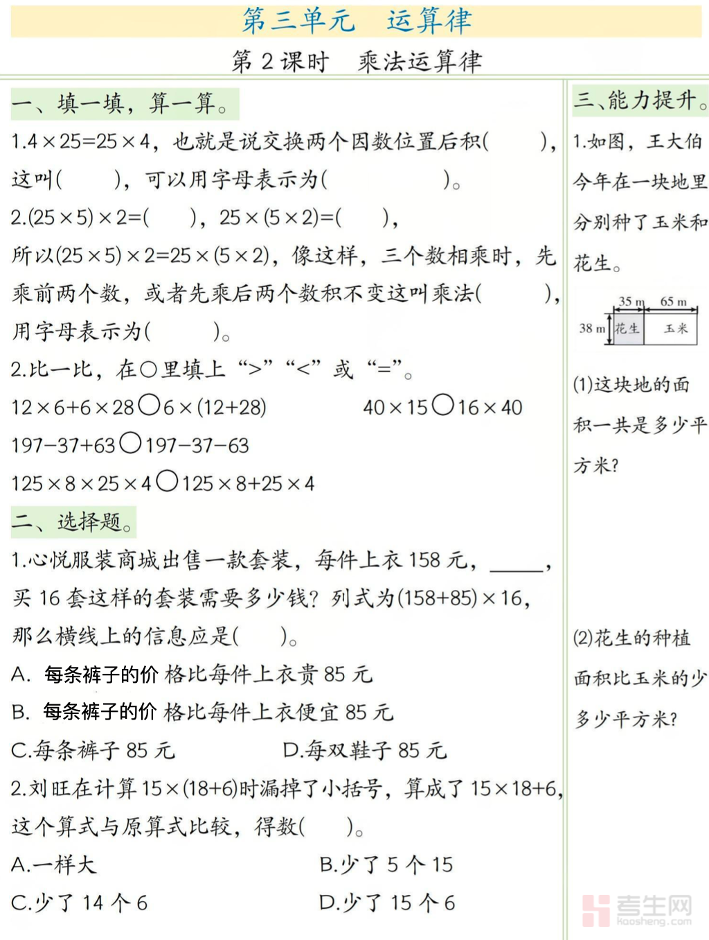 小学数学第三单元一课一练(四年级下)同步苏教版四年级下册数学第三单元教学进度,与每课时课堂内容精准匹配,全面覆盖三位数乘两位数计算、积的变化规律、常见数量关系、乘数末尾有 0 的简便运算、两步计算实际问题等核心知识点,每课时练习分基础、提升、拓展三个层次,题型涵盖填空、选择、竖式计算、解决问题等,着重训练学生计算准确率、运算技巧运用、数量关系分析与解题步骤规范能力,难度贴合四年级教学要求,题量适中适合日常练习。适合四年级学生随堂巩固、课时自测、课后强化、预习复习使用,及时消化每课时知识点,稳步提升数学运算与应用能力。请添加微信 18617049513 进专属群,获取更多免费资源!