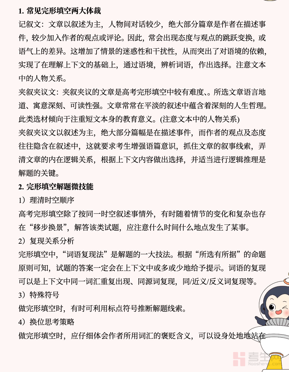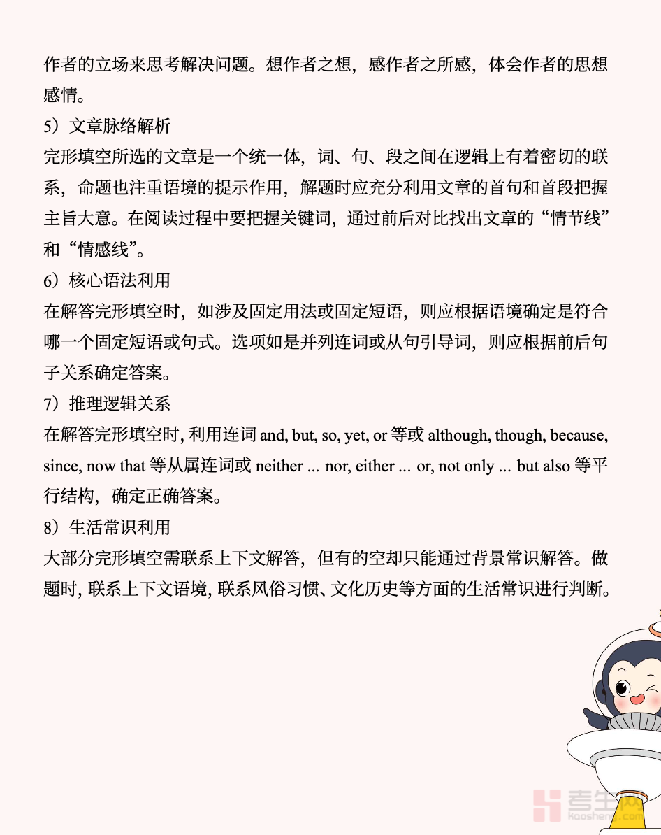 初中英语完形填空解题方法指导专为初中各年级学生打造,聚焦完形填空高频考点与失分痛点,系统讲解语境分析、逻辑判断、固定搭配、词义辨析、语法运用五大核心解题技巧,结合典型例题拆解答题步骤,教会学生先通读把握主旨、再逐空推敲、最后复读校验的科学思路,针对性解决看不懂文意、选不对词汇、逻辑混乱等问题。内容通俗易懂、实用性强,既能夯实英语基础,又能快速提升解题正确率与答题速度,适合初一至初三学生日常练习、考前冲刺使用,有效攻克完形填空难点,助力英语成绩稳步提升。请添加微信 18617049513 进专属群,获取更多免费资源!
