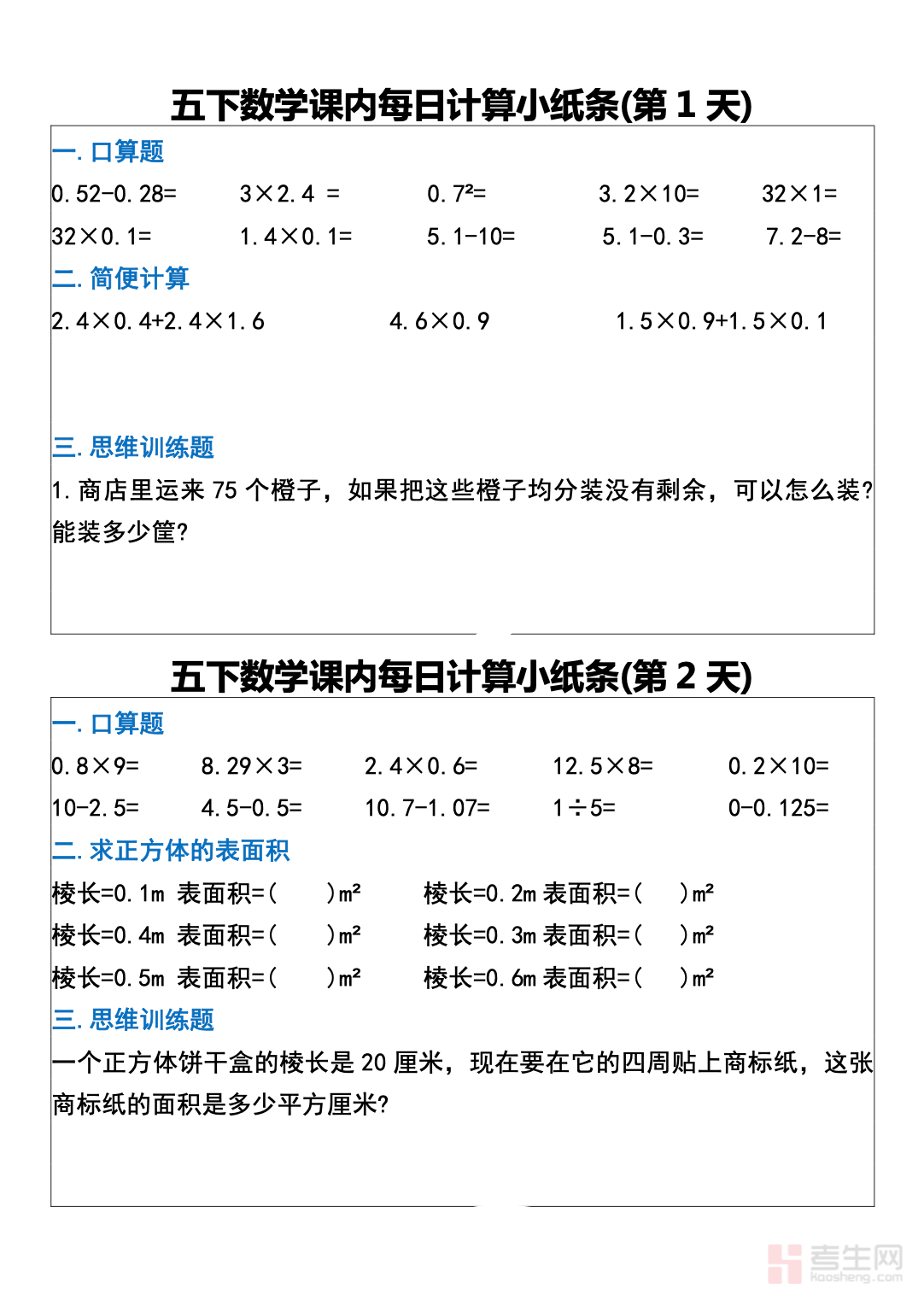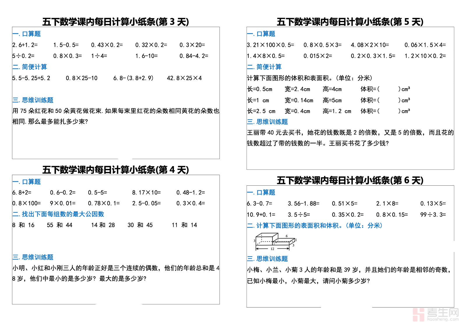 26 春小学数学每日一练小纸条(人教版五年级下)紧跟春季教学进度,同步人教版教材核心知识点,涵盖因数与倍数、长方体正方体表面积与体积、分数的意义和基本性质、分数加减法及实际应用等重点内容,采用每日小练的轻量化形式,题型精简聚焦,着重强化计算基本功、概念理解、易错点纠正和应用题解题逻辑,题量适中不增加学习负担,便于学生利用碎片时间练习。资料清晰实用、可直接打印,适合五年级学生日常巩固、课前预习与课后查漏补缺,坚持练习能有效提升计算速度与准确率,夯实数学基础,培养良好学习习惯。请添加微信 18617049513 进专属群,获取更多免费资源!