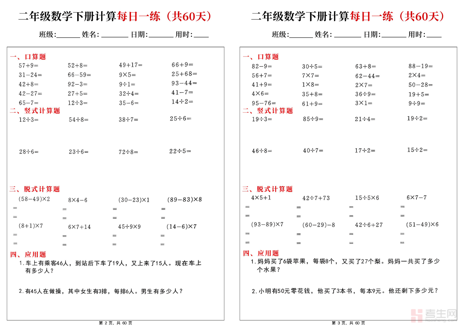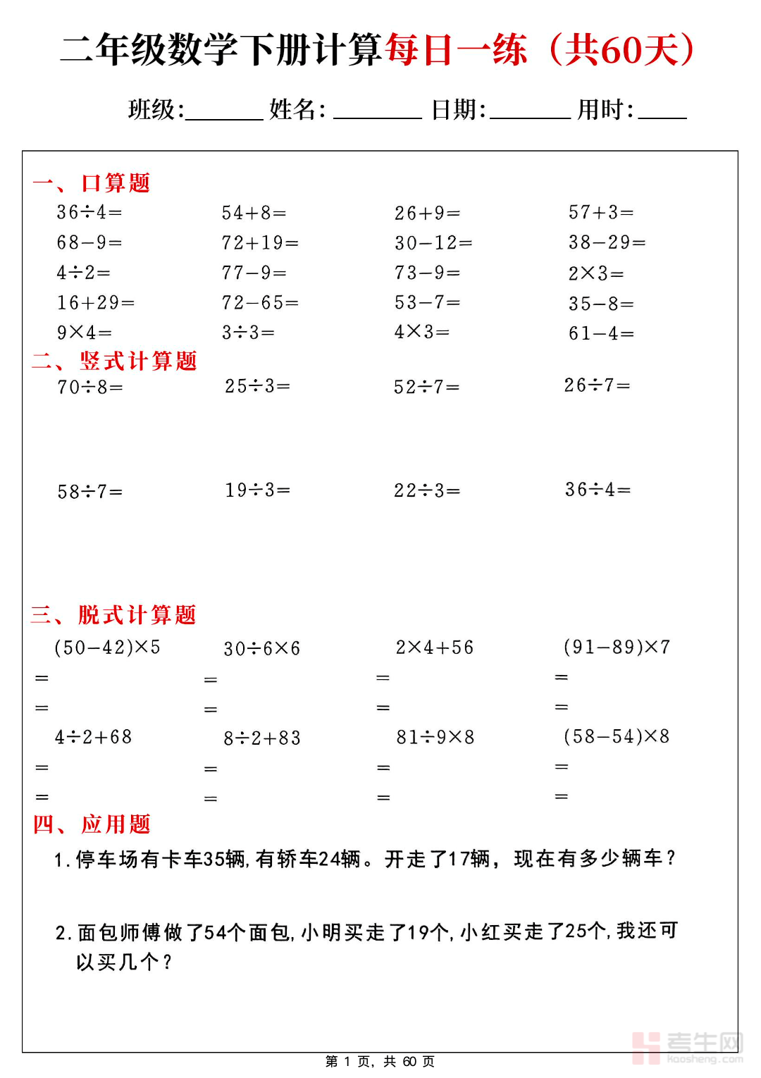 26 春小学数学每日一练小纸条(人教版二年级下)同步人教版二年级下册教材内容,紧扣表内除法、有余数的除法、万以内数的认识、克和千克、混合运算、图形的运动等核心知识点,采用每日一题轻量化设计,题型简单易懂,重点强化口算速度、计算规范、简单逻辑思维、生活数学应用,题量适中适合低年级练习,可直接打印使用。适合二年级学生课后巩固、每日打卡、课前预习,帮助孩子扎实掌握基础运算,培养数学学习习惯,稳步提升数学基础能力与解题信心。请添加微信 18617049513 进专属群,获取更多免费资源!