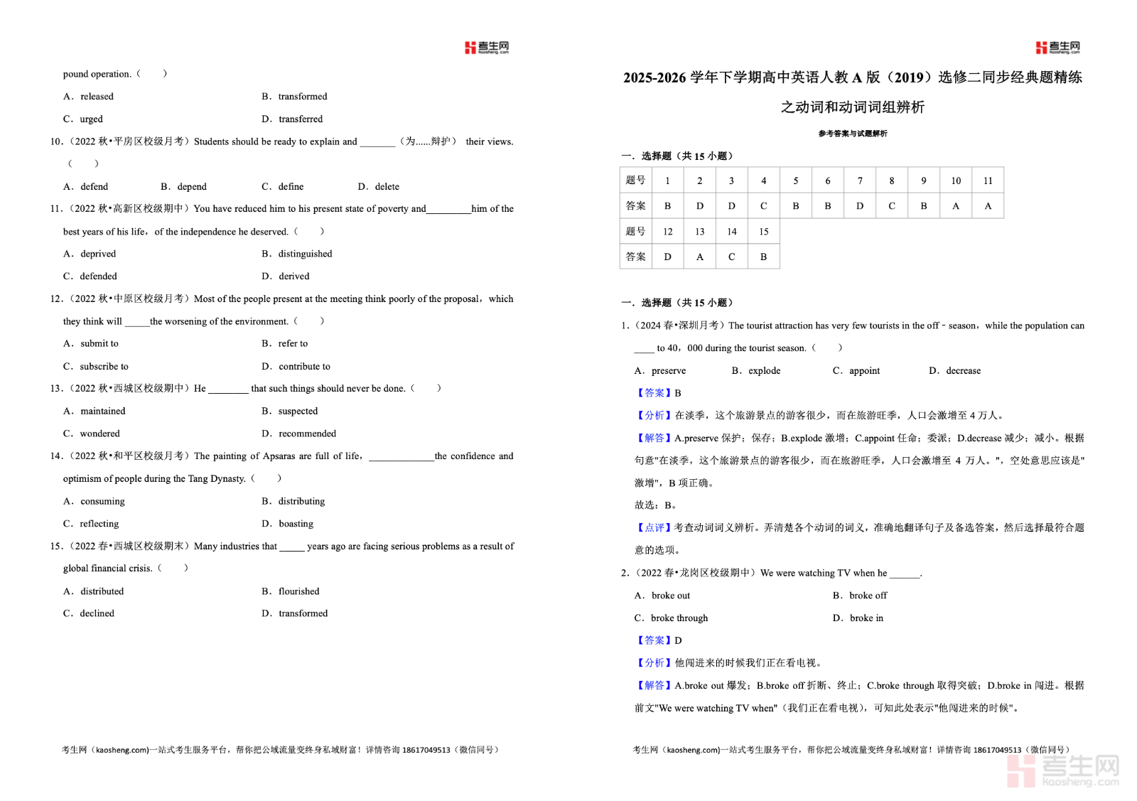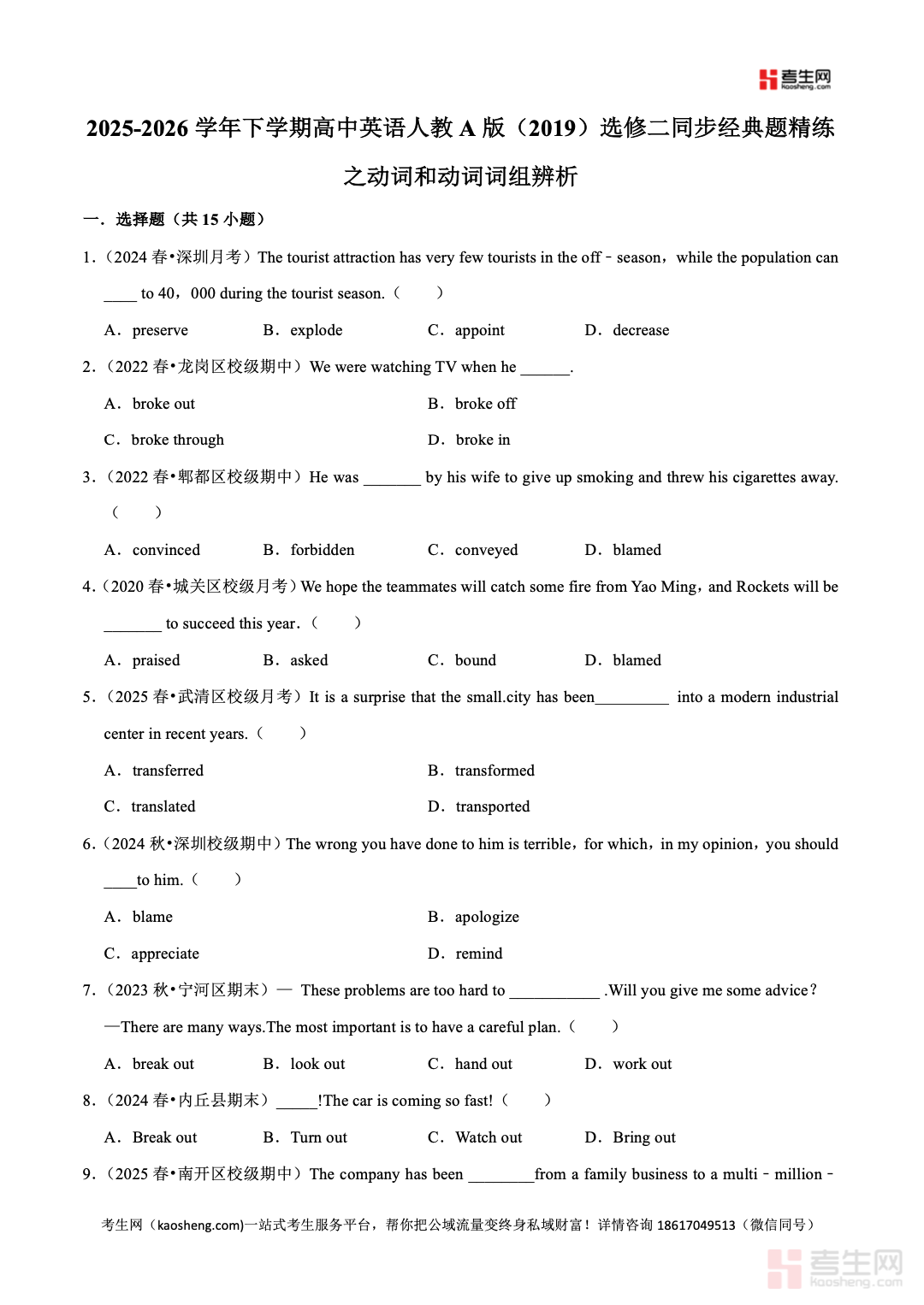 2025-2026 学年下学期高中英语人教 A 版(2019)选修二同步经典题精练之动词和动词词组辨析,同步教材单元知识点,聚焦高频易混动词、固定动词短语、语境词义辨析等核心考点,精选期中期末常考经典题型,涵盖单项选择、语法填空、短文改错等实用题型,重点强化词义区分、固定搭配记忆、语境用法判断、解题技巧运用能力。内容贴合高二下学期教学进度,题目由浅入深、解析详细,适合学生课后巩固、专项突破与考前复习,帮助学生快速攻克动词辨析易错点,提升词汇运用准确率与英语应试得分能力。请添加微信 18617049513 进专属群,获取更多免费资源!