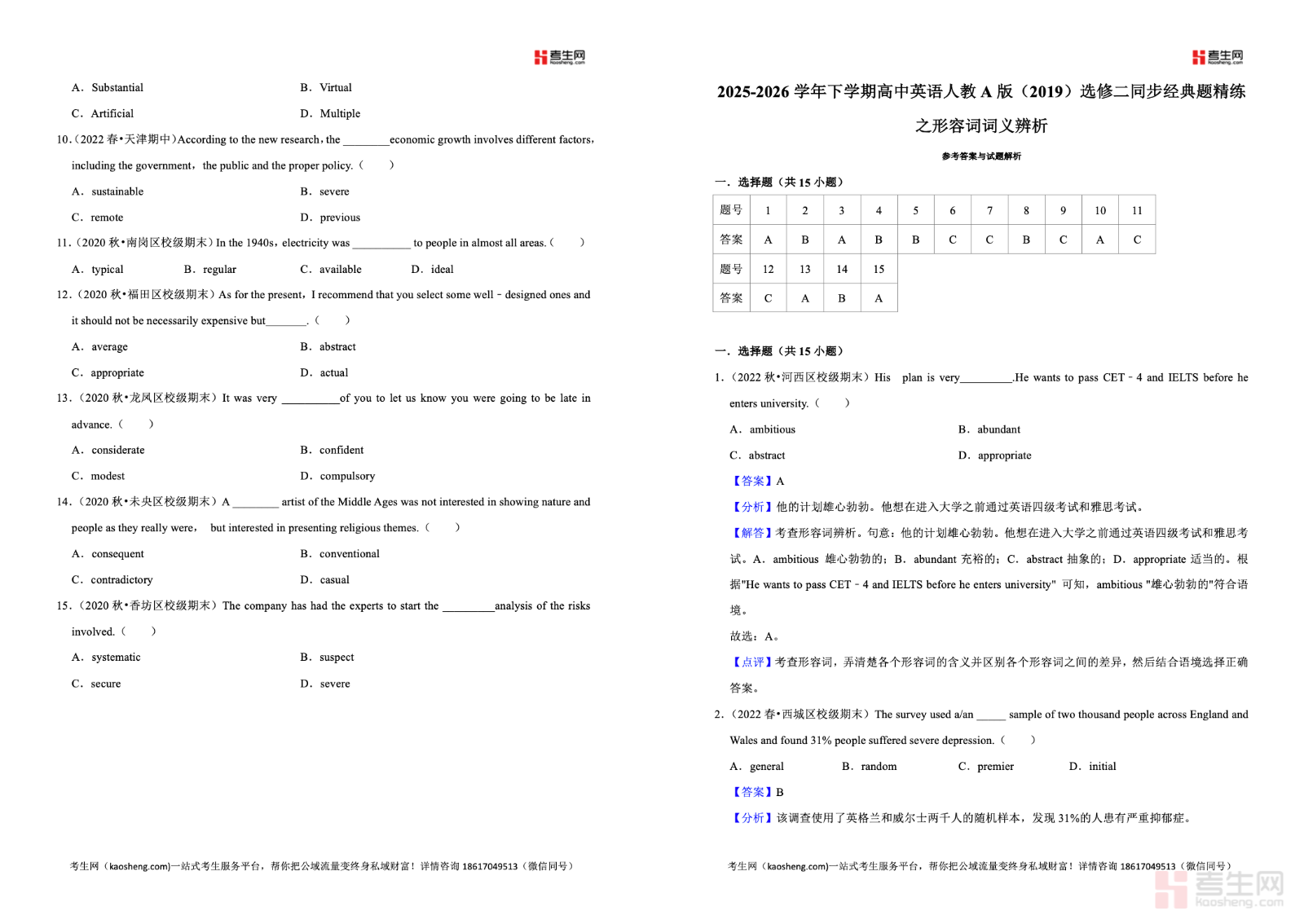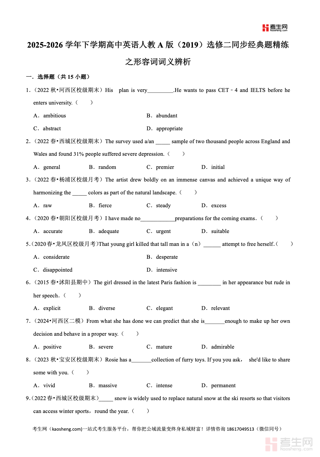 2025-2026 学年下学期高中英语人教 A 版(2019)选修二同步经典题精练之形容词词义辨析,同步教材单元词汇体系,聚焦近义形容词区分、情感色彩判断、语境搭配选择、固定形容词短语等核心考点,精选语法填空、单项选择、完形填空等高频题型,强化词义精准理解、语境逻辑匹配、易混词区分、答题速度提升能力。内容贴合高二下学期学习进度与期中期末考情,题目由浅入深、解析详实易懂,适合学生课后巩固、专项突破与考前查漏补缺,帮助学生攻克形容词辨析易错点,提升词汇运用准确率与英语应试综合能力。请添加微信 18617049513 进专属群,获取更多免费资源!