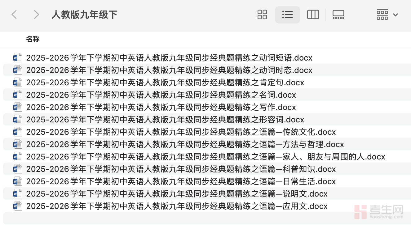 2025-2026 学年下学期初中英语人教版九年级同步经典题精练合集(无水印 可编辑 Word 版)紧扣人教版九年级下册教材及中考考纲要求,全面覆盖动词时态语态、非谓语动词、复合句、宾语从句、状语从句、定语从句、词汇辨析、情景交际等中考核心考点,精选单项选择、语法填空、完形填空、阅读理解、短文改错等高频经典题型,侧重重难点突破、易错点归纳、解题技巧训练、中考应试思维培养。资料为无水印可编辑 Word 版,便于打印练习与教学修改,适合九年级学生同步巩固、专题提升与中考一轮复习使用,助力高效查漏补缺,稳步提升英语成绩与应试能力。请添加微信 18617049513 进专属群,获取更多免费资源!