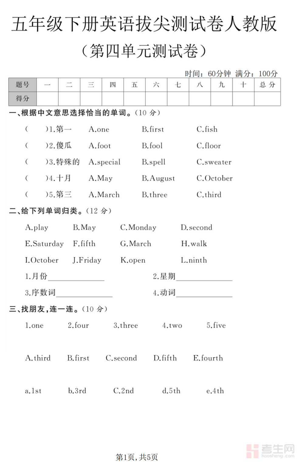 小学英语第四单元拔尖测试卷(人教版)(五年级下)紧扣人教版五年级下册英语第四单元教材知识点,围绕单元核心单词、重点句型、日常交际用语展开命题,全面涵盖听力辨析、单项选择、英汉互译、情景对话、阅读理解、书面表达等常见题型,注重基础夯实、语境运用、易错点突破、拔尖能力拓展。试卷难度梯度合理,贴合小学阶段教学要求与单元检测标准,既能准确检测学生本单元的学习掌握情况,也能帮助学生查漏补缺、强化薄弱环节,适合五年级学生进行单元自测、课后巩固以及考前冲刺练习,有效提升英语综合运用与应试答题能力。请添加微信 18617049513 进专属群,获取更多免费资源!