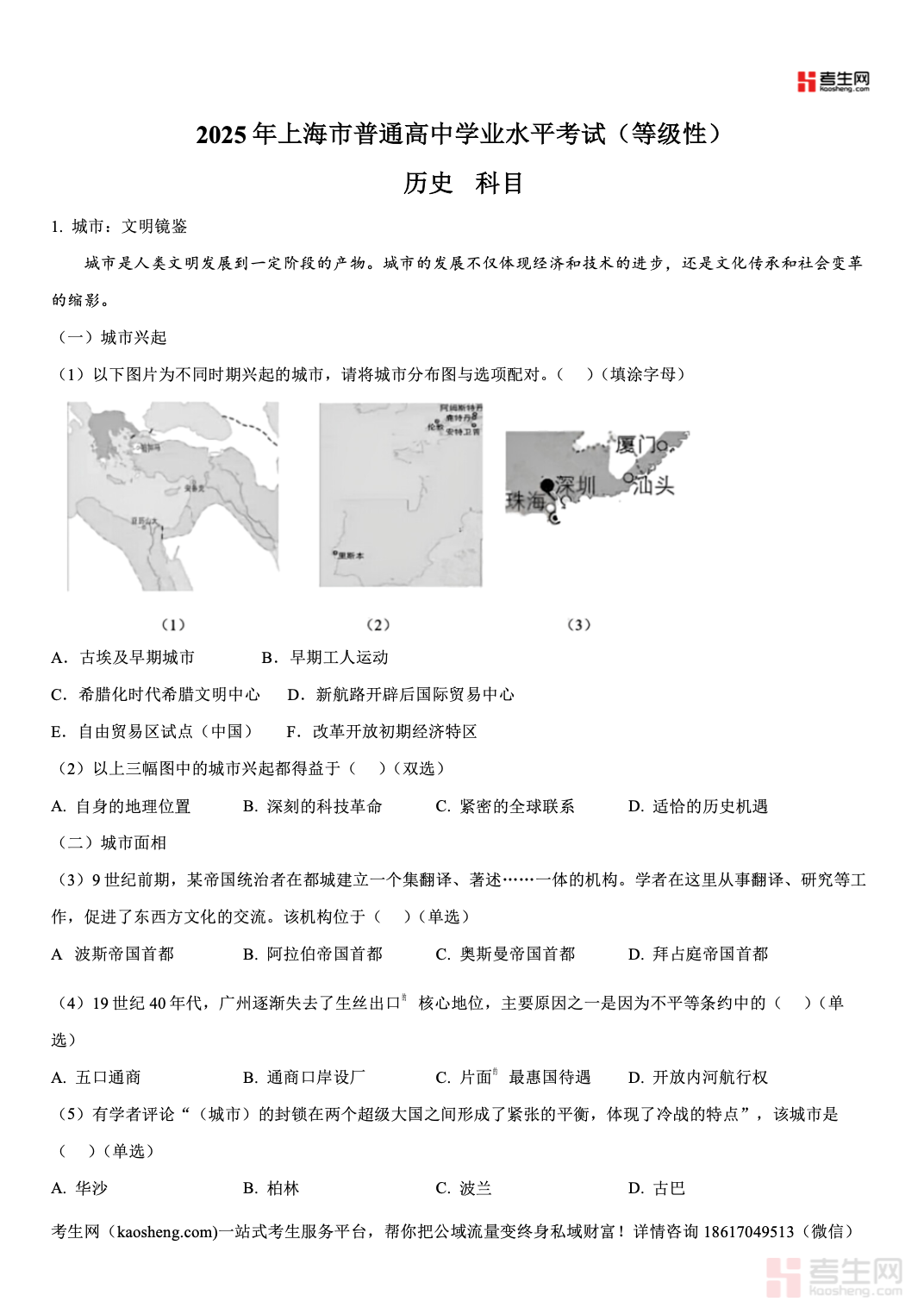 高考真题:2025 年上海高考历史真题(原卷版)完整收录 2025 年上海高考历史全卷试题,严格贴合上海卷命题特点与学业水平等级考要求,全面覆盖中国古代史、中国近现代史、世界史、史料实证、历史解释、时空观念等核心素养考点。解析内容详实透彻,包含答案详解、考点定位、解题思路、答题规范、易错点分析,帮助考生清晰掌握命题趋势与答题技巧。资料适用于高三学生真题模拟、考后估分、专题复习与查漏补缺,精准对接上海本地备考需求,有效提升历史学科解题能力与应试水平。请添加微信 18617049513 进专属群,获取更多免费资源!