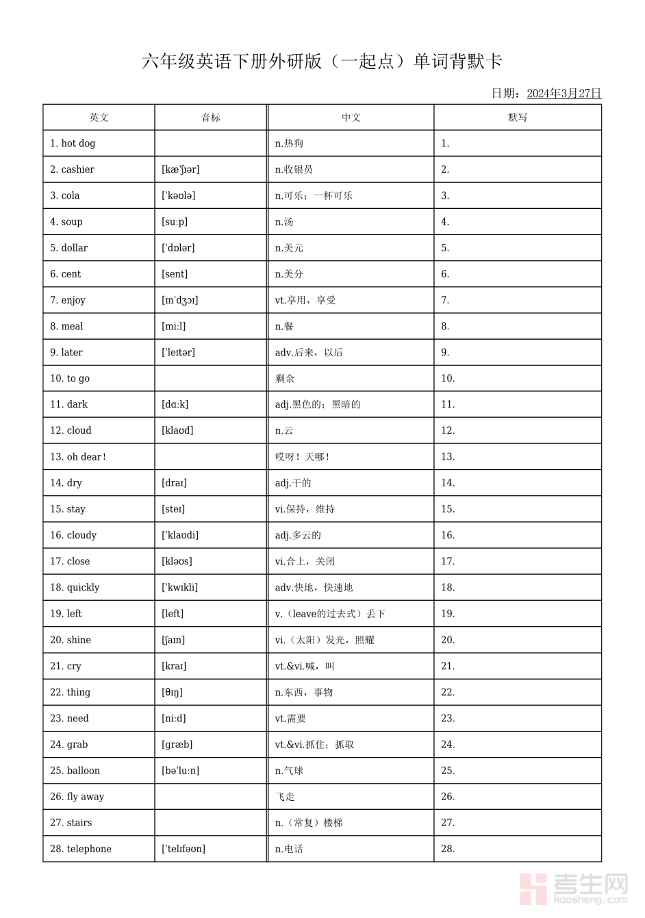 小学英语单词默背卡(六年级下)同步六年级下册英语教材核心词汇编制,适合家长学堂辅导使用,卡片式设计方便孩子随时随地记忆,涵盖课标必背单词、重点短语、高频拓展词汇,内容贴合小升初英语考查要求。每张卡片包含单词拼写、音标、中文释义,搭配简洁例句辅助理解,侧重拼写准确性、英汉互译、快速默背,帮助孩子强化单词记忆效果,减少遗忘。资料实用性强,可用于日常听写、自主默写、考前突击复习,有效夯实词汇基础,提升英语读写能力,为小升初英语备考做好充分准备。请添加微信 18617049513 进专属群,获取更多免费资源!