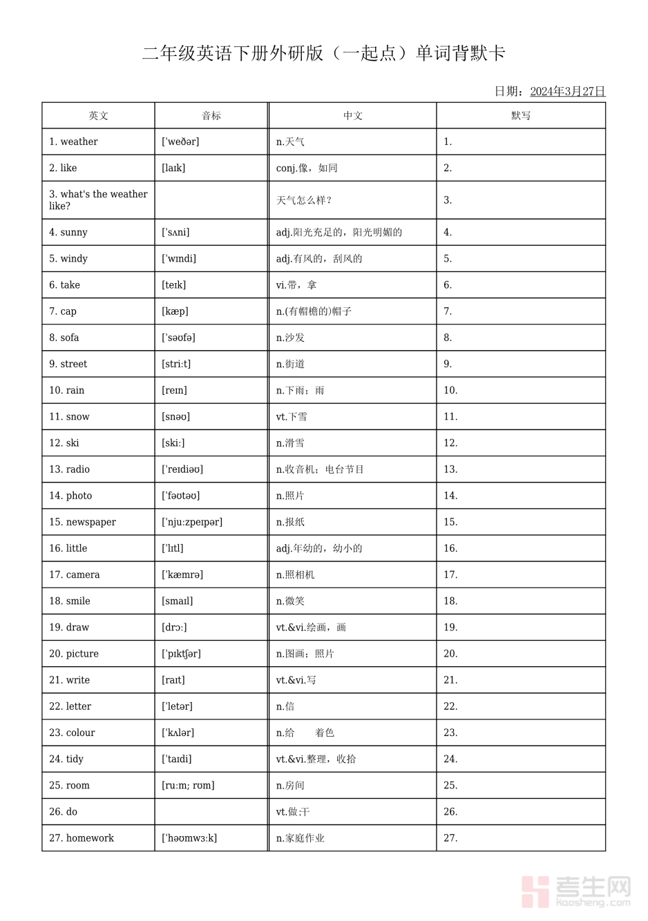 小学英语单词默背卡(二年级下)专为低年级英语启蒙阶段设计,作为实用备考资料贴合小学低年级英语考查重点,同步教材收录基础认读词汇、日常交际单词、简单主题词汇,内容浅显易懂,搭配直观释义方便孩子快速理解。卡片式设计便于携带,适合碎片时间反复记忆,重点强化单词认读、发音感知、初步拼写,帮助孩子积累基础词汇量,培养英语语感与学习兴趣。资料适配课堂复习与家庭自测,可有效巩固课堂所学,减少词汇遗忘,提升单词记忆效果,为孩子后续英语学习打下扎实的启蒙基础。请添加微信 18617049513 进专属群,获取更多免费资源!