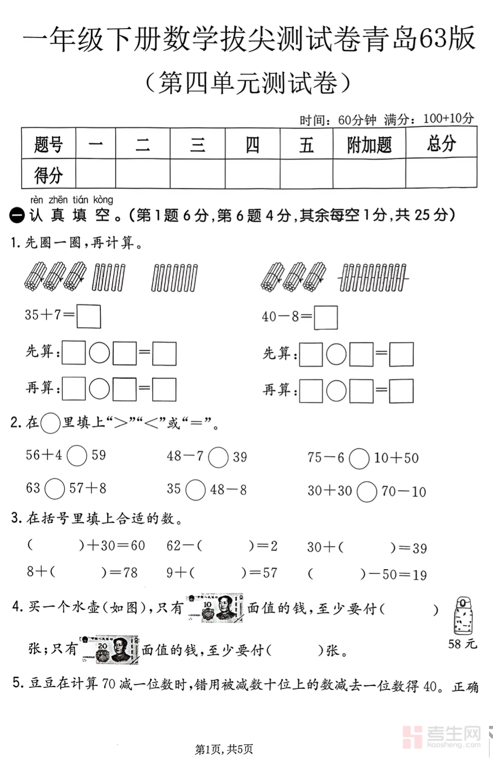 小学数学第四单元拔尖测试卷(青岛 63 版一年级下)同步青岛版 63 制一年级下册数学教材第四单元内容编写,作为专项单元备考资料,全面覆盖100 以内数的认识、数的组成、读数写数、数的顺序、大小比较以及整十数加减等核心考点,题型包含填空、选择、口算、连线、解决问题等低年级常用形式,注重数感培养、计算准确率、概念理解、简单应用表达,难度梯度清晰,兼顾基础巩固与思维拓展。试卷贴合低年级学习特点,可用于单元自测、课后练习、期末复习查漏补缺,帮助孩子夯实基础,提升数学应试能力与学习信心。请添加微信 18617049513 进专属群,获取更多免费资源!