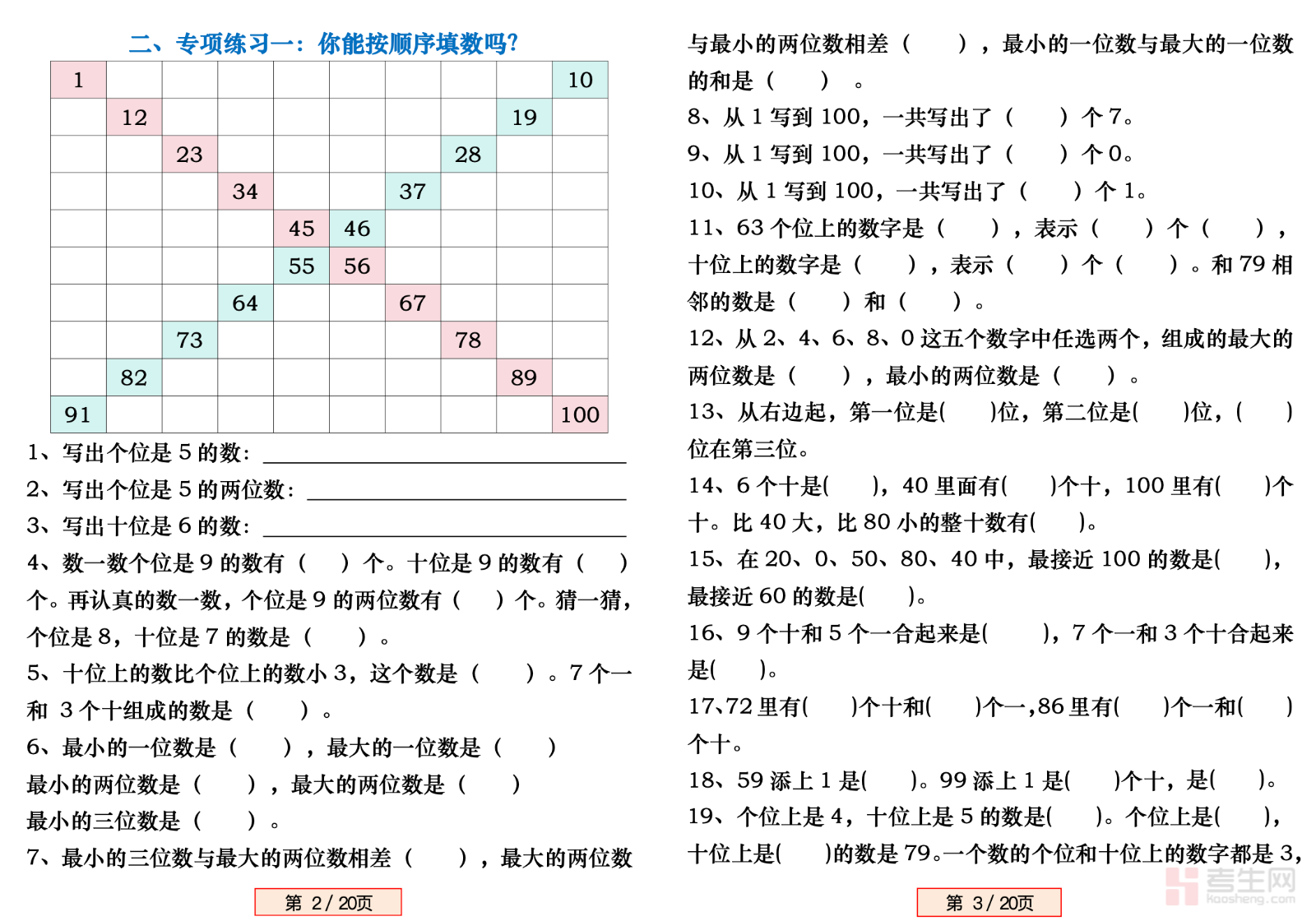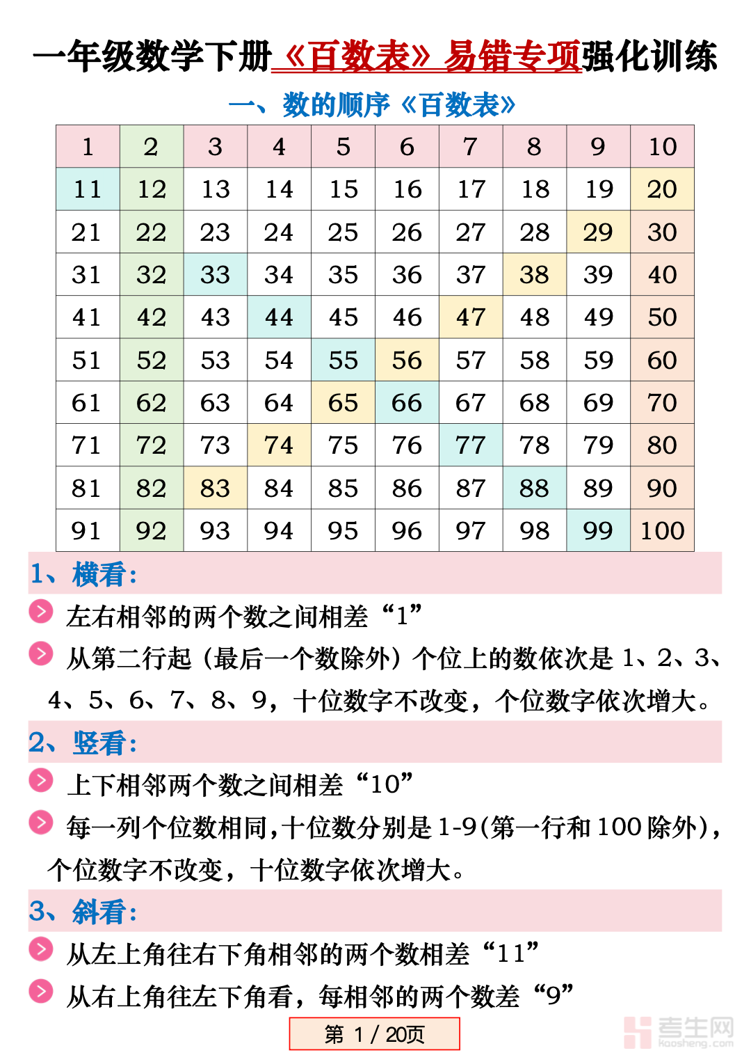 小学数学百数表易错专项强化训练(一年级下)针对一年级下册百数表核心知识点与高频易错点编写,是实用数学专项备考资料,内容聚焦百数表规律、数字定位、相邻数查找、行与列关系、前后左右数字推算、大小比较等重点内容,针对学生常错题型进行集中强化,着重提升数感建立、逻辑推理、规律观察、快速填数能力,通过阶梯式练习巩固百数表核心用法,帮助孩子攻克易混淆、易填错问题,熟练掌握解题技巧。资料贴合单元测试与期末复习要求,适合课堂巩固与家庭自测,有效提高数学基础与应试准确率。请添加微信 18617049513 进专属群,获取更多免费资源!