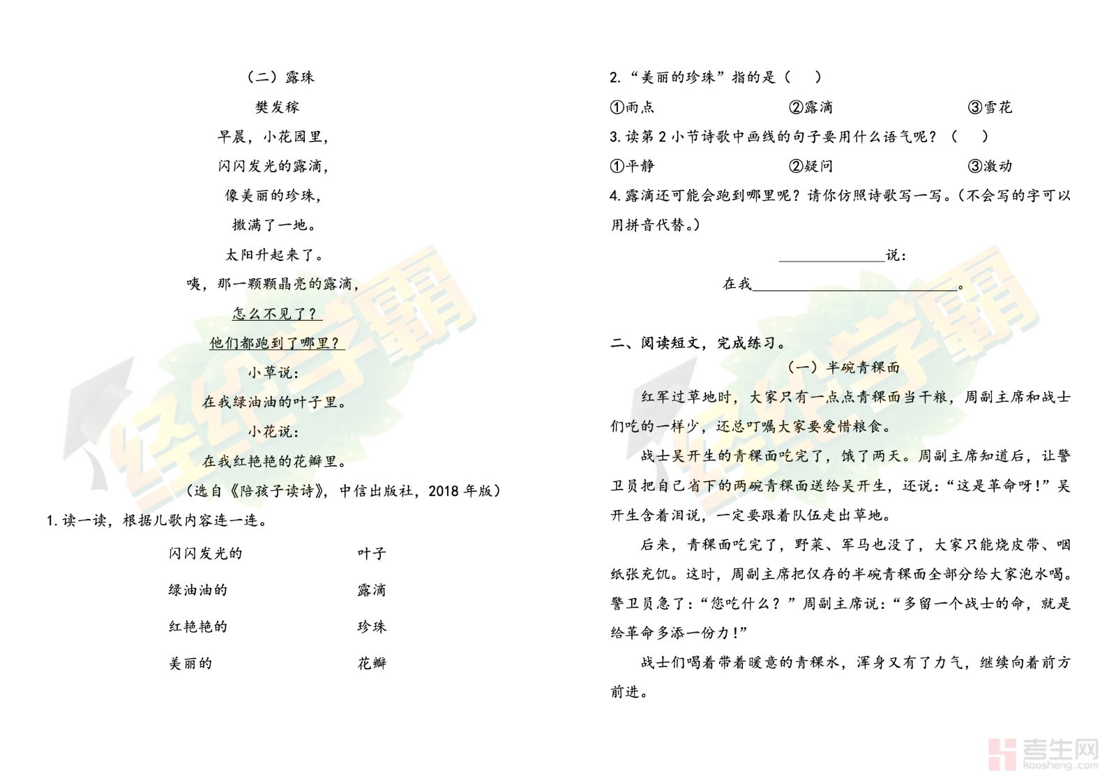小学语文清明阅读专项练习(一年级下)结合传统节日清明主题设计,是适配一年级下册的语文阅读备考资料,内容围绕清明习俗、节气特点、经典短句、简单文段理解、字词认读展开,题型包含生字认读、词语填空、句子理解、简单问答等,贴合低年级阅读考查要求,着重训练文本细读、信息提取、语句通顺、节日认知能力。练习难度适中,图文结合更易理解,既能帮助孩子了解传统文化知识,又能提升基础阅读答题能力,适合单元拓展、节日专项练习与考前基础巩固,全面培养语文阅读素养与答题习惯。请添加微信 18617049513 进专属群,获取更多免费资源!