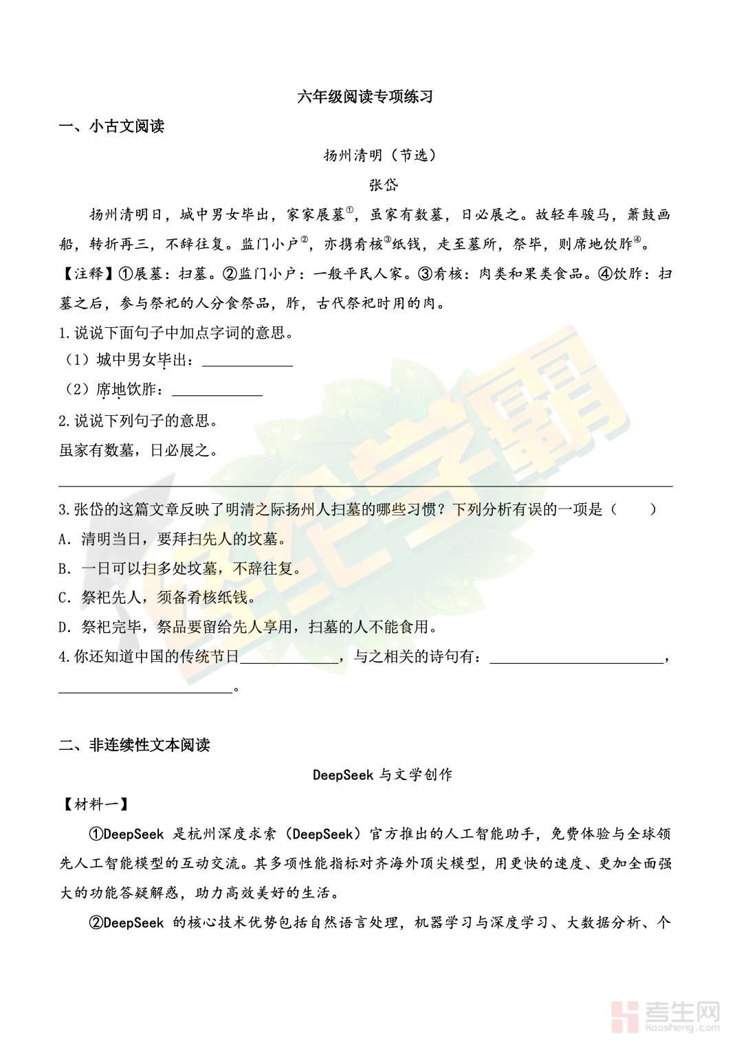 小学语文清明阅读专项练习(六年级下)紧扣小学毕业阶段阅读考查要求,以清明传统文化、缅怀纪念、民俗散文、写景抒情类文本为核心素材,是适配六年级下册的语文备考资料。内容涵盖记叙文、说明文、散文及古诗文片段,题型聚焦重点词句深层含义、段落结构作用、中心思想提炼、人物情感品味、表达手法鉴赏、联系生活拓展表达,着重强化深度阅读理解、答题逻辑严谨性、规范作答格式、综合概括与赏析能力,直击小升初阅读高频考点与易错点。既能帮助学生巩固阅读答题技巧,提升应试得分能力,又能加深对传统节日文化的理解,适合课堂专项训练、课后巩固及毕业总复习阶段使用。请添加微信 18617049513 进专属群,获取更多免费资源!