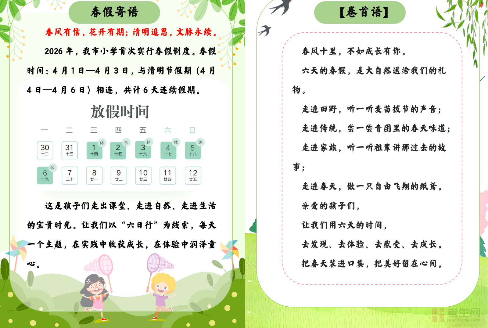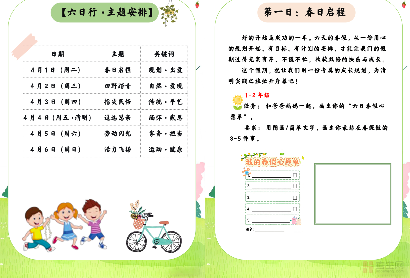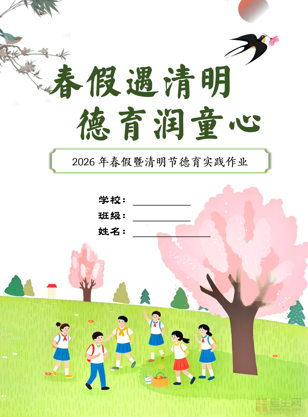 2026 年春假暨清明节实践作业贴合中小学生学段特点,结合春假踏青与清明节传统文化设计,是适配校园布置的优质实践备考资料。作业涵盖传统文化探究、缅怀先烈致敬、亲子实践体验、绿色文明祭扫、春日观察记录五大板块,包含手抄报创作、习俗调研、先烈事迹分享、踏青日记、公益祭扫等丰富形式,兼顾实践性、教育性、趣味性、创新性。作业难度分层适配各年级,既落实传统文化传承与爱国感恩教育,又培养学生动手能力、观察能力与表达能力,可直接作为春假期间校园实践任务,帮助学生在实践中感受节日内涵,丰富假期生活。请添加微信 18617049513 进专属群,获取更多免费资源!