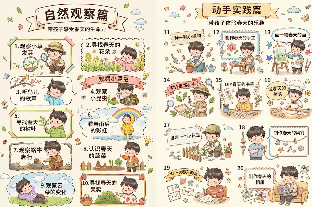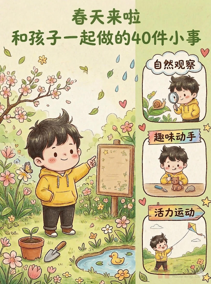 春天和孩子一起做的 40 件小事专为家庭亲子陪伴与学生实践活动设计,内容涵盖春日观察、自然探索、手工创作、户外游玩、劳动实践、节气体验等丰富场景,每件小事简单易操作、趣味性强,既贴合春季特点,又能培养孩子观察力、动手能力、表达能力、生活感知力。资料适合作为小学生假期实践作业、亲子打卡任务、语文写作素材,帮助孩子在亲近自然的过程中积累生活体验,丰富习作灵感,同时增进亲子互动。内容实用易懂,可直接参照执行,兼顾教育性与趣味性,助力学生全面发展与综合素质提升。请添加微信 18617049513 进专属群,获取更多免费资源!