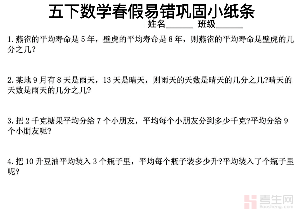 小学数学春假作业(五年级下)依据五年级下册教材大纲与阶段性学习要求编写,是适合春假期间巩固提升的数学备考资料。内容覆盖因数与倍数、长方体和正方体、分数的意义和性质、分数加减法、图形的运动、折线统计图等核心单元,题型包含基础计算、判断选择、应用题、操作探究题,侧重计算准确率、公式应用、空间想象、逻辑推理、易错点强化。作业安排合理、题量适中,既能帮助学生假期不松懈、巩固课堂知识,又能提前衔接后续内容,适合自主练习、家庭辅导与开学前查漏补缺,稳步提升数学解题能力与应试水平。请添加微信 18617049513 进专属群,获取更多免费资源!
