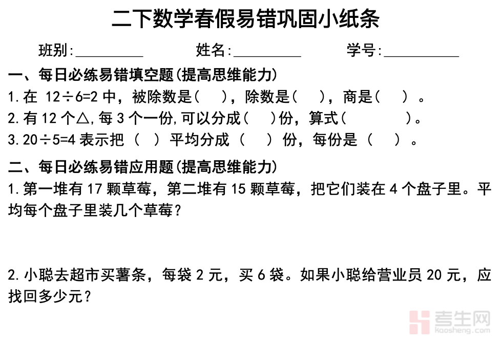 小学数学春假作业(二年级下)紧扣二年级下册数学教材重难点与低年级学习特点精心编排,是适合学生春假期间巩固提升的优质练习资料。内容覆盖表内除法、混合运算、万以内数的认识、克和千克、图形的运动、数据收集整理等核心知识点,题型包含口算、填空、选择、简单应用题及趣味操作题,侧重基础计算能力、数学概念理解、题意分析、规范书写、简单逻辑思维。作业题量适中、难度贴合低年级水平,既能帮助孩子在假期巩固知识、防止遗忘,又能培养良好的学习习惯,为开学后学习打好基础,适合学生自主练习与家长辅导使用。请添加微信 18617049513 进专属群,获取更多免费资源!