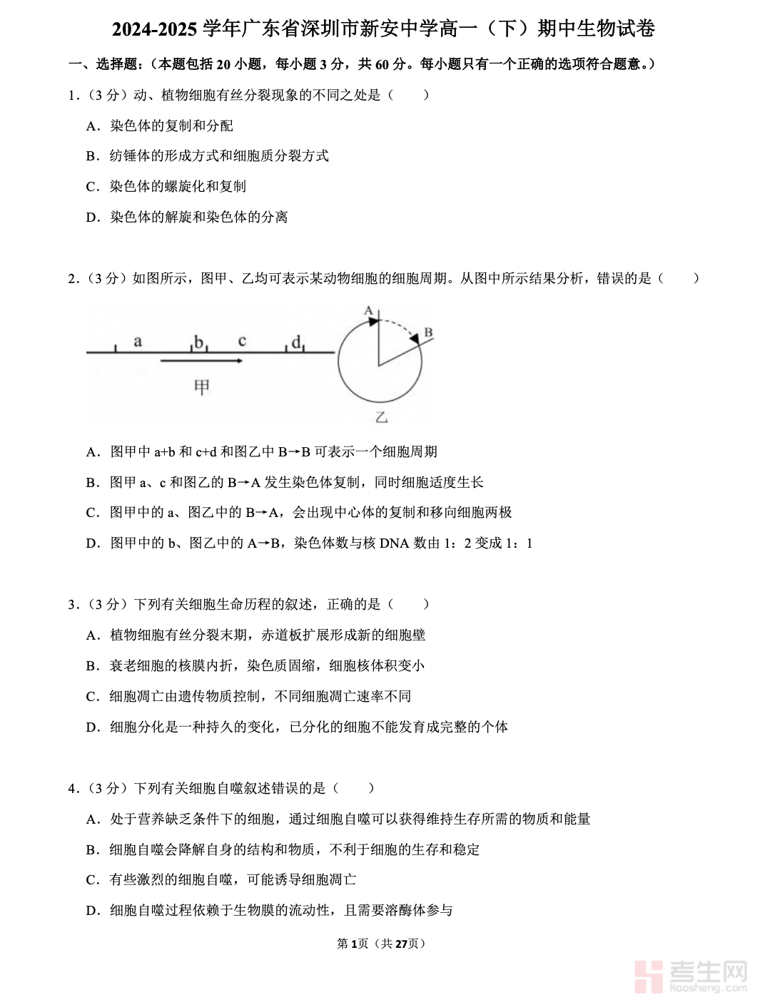2024-2025 学年广东省深圳市新安中学高一(下)期中生物试卷严格依据深圳本地教学大纲命制,完整覆盖细胞的生命历程、减数分裂、孟德尔遗传规律、DNA 结构与复制、基因表达等高一期中核心考点,贴合新安中学教学进度与考试难度。试卷包含选择题、图表分析题、实验探究题、综合简答题等全题型,注重基础概念辨析、遗传计算、图表信息提取、实验思路分析,考点分布均衡、难度适中,能有效检测学生知识掌握情况。附带完整答案与详细解析,方便学生订正错题、梳理薄弱环节,适合高一学生期中复习、模拟自测、巩固提升,快速提高生物应试能力。请添加微信 18617049513 进专属群,获取更多免费资源!