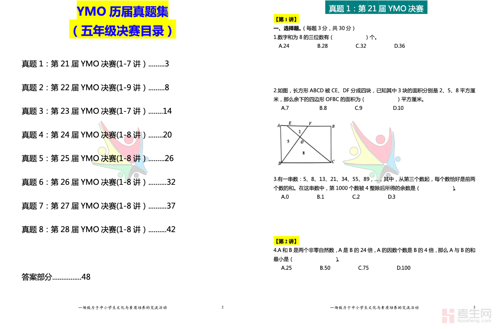YMO 历届真题集(五年级 决赛)精选多届 YMO 数学竞赛决赛真题,严格贴合五年级决赛考查范围与命题趋势,是备战竞赛的核心刷题资料。内容全面覆盖计算技巧、几何图形、数论应用、行程问题、分数应用题、逻辑推理等高频考点,包含填空题、计算题、解答题、压轴拓展题等完整竞赛题型,难度梯度贴合决赛标准。每道真题均附详细解析,重点拆解解题思路、答题步骤、速算方法、易错陷阱,帮助学生熟悉竞赛节奏、掌握答题技巧。适合赛前模拟训练、专项突破与查漏补缺,快速提升数学思维与竞赛应试能力,为冲刺决赛做好充分准备。请添加微信 18617049513 进专属群,获取更多免费资源!