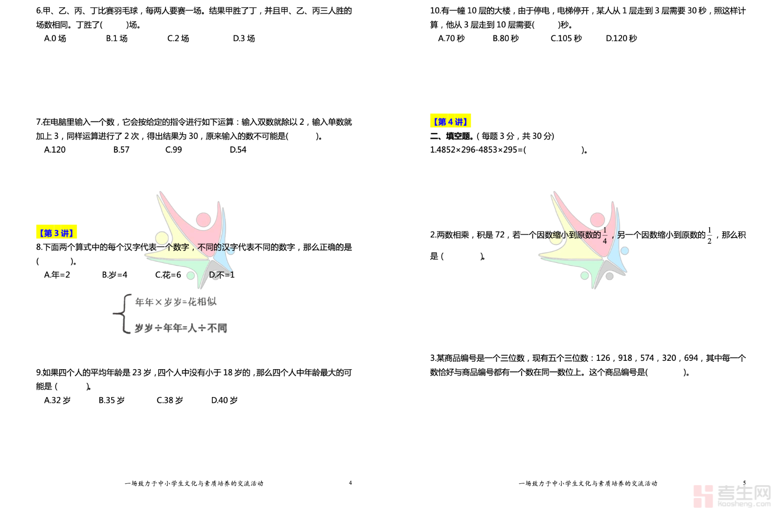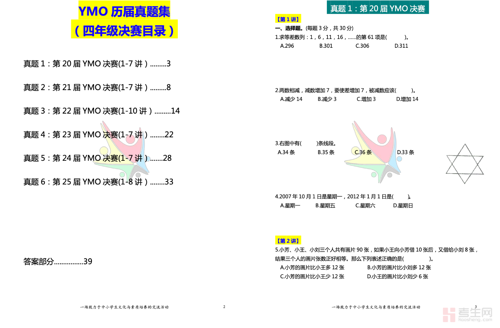 YMO 历届真题集(四年级 决赛)收录多届 YMO 青少年数学奥林匹克四年级决赛官方真题,精准匹配赛事考纲与命题风格,是备战决赛的核心实战资料。内容全面覆盖整数巧算、和差倍问题、鸡兔同笼、周期问题、几何计数、逻辑推理、植树问题等决赛高频考点,题型包含填空、计算、解答、拓展探究等完整竞赛题型,难度贴合决赛水平。每套真题均配有详细解题步骤,重点讲解解题思路、简便算法、易错点分析、答题规范,帮助学生熟悉竞赛节奏、查漏补缺、强化思维。适合赛前刷题、模拟自测、专项拔高,有效提升数学竞赛能力与应试得分率。请添加微信 18617049513 进专属群,获取更多免费资源!