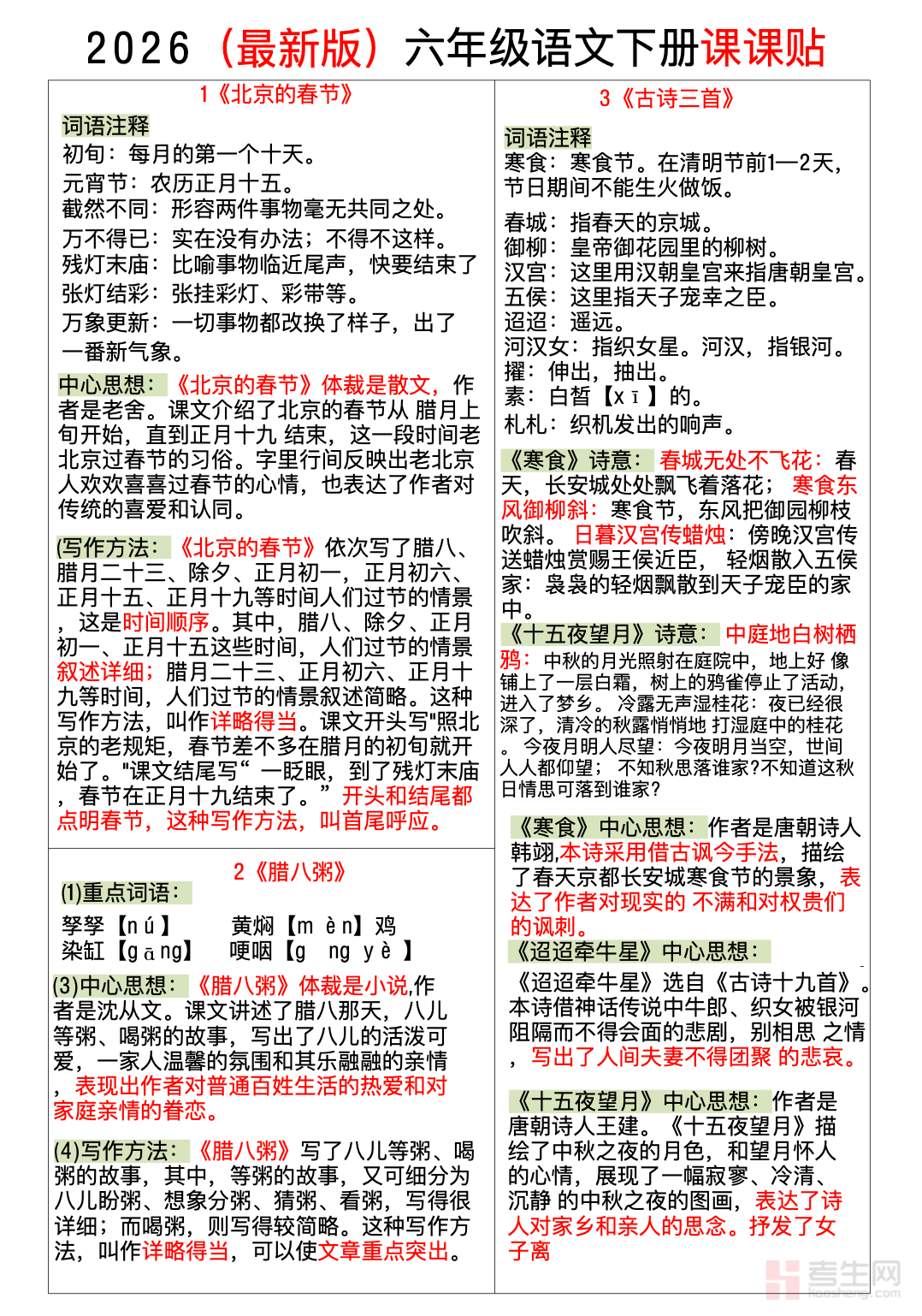 26 春小学语文彩色一课一贴(六年级下)同步部编版六年级下册教材内容,按课文课时设计,采用彩色排版更易识记,贴合毕业班语文复习与课堂巩固需求。内容覆盖生字词积累、重点句段解析、中心思想归纳、课文考点梳理、课后习题拓展,每课提炼核心知识点与考试高频考点,突出知识点清晰、重点突出、随学随记、方便查阅,兼顾预习、随堂练习与期末复习使用。资料贴合小学毕业备考节奏,帮助学生系统夯实语文基础,强化课文理解与答题能力,为小升初考试做好充分准备。请添加微信 18617049513 进专属群,获取更多免费资源!