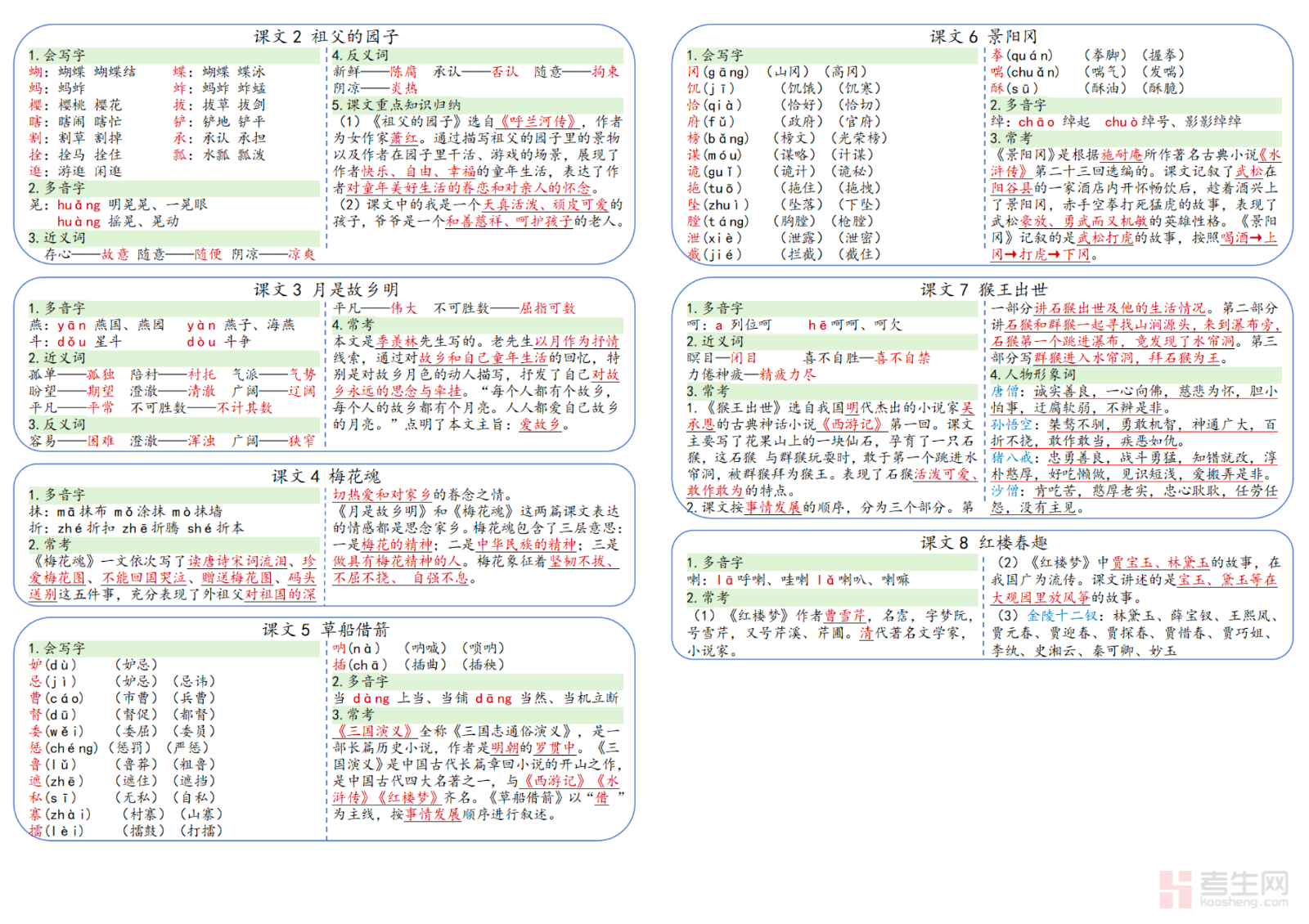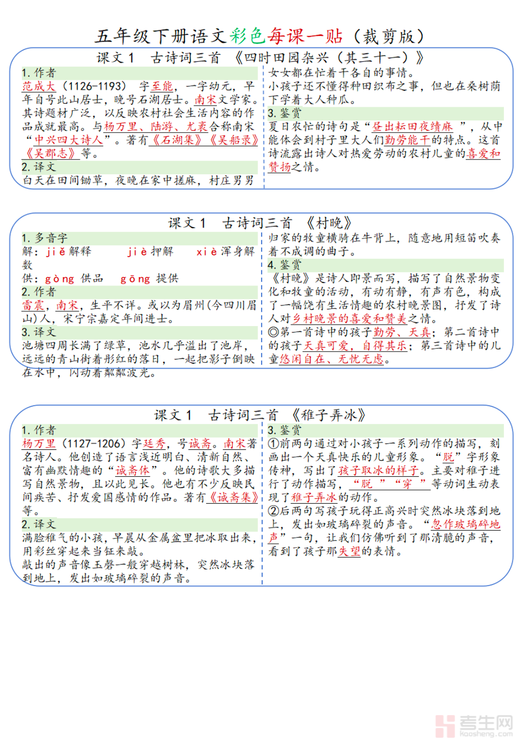 26 春小学语文彩色一课一贴(五年级下)同步部编版五年级下册课本内容,采用彩色排版设计,知识点醒目易记,适合随堂学习与课后巩固。资料按课文逐课整理,涵盖生字词听写、近反义词、重点句赏析、段落大意、中心思想、课内必背考点,提炼每课高频考点与易错点,做到一课一重点、一贴一梳理,方便学生快速掌握核心内容。既可用于课前预习标记、课上重点记录,也可用于单元复习与考前查漏补缺,帮助学生扎实掌握课文知识,提升阅读理解与基础应试能力,稳步提高语文成绩。请添加微信 18617049513 进专属群,获取更多免费资源!
