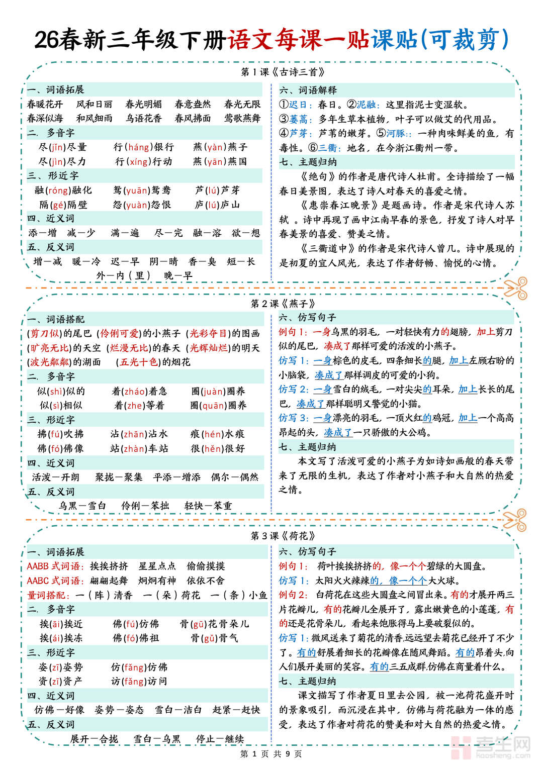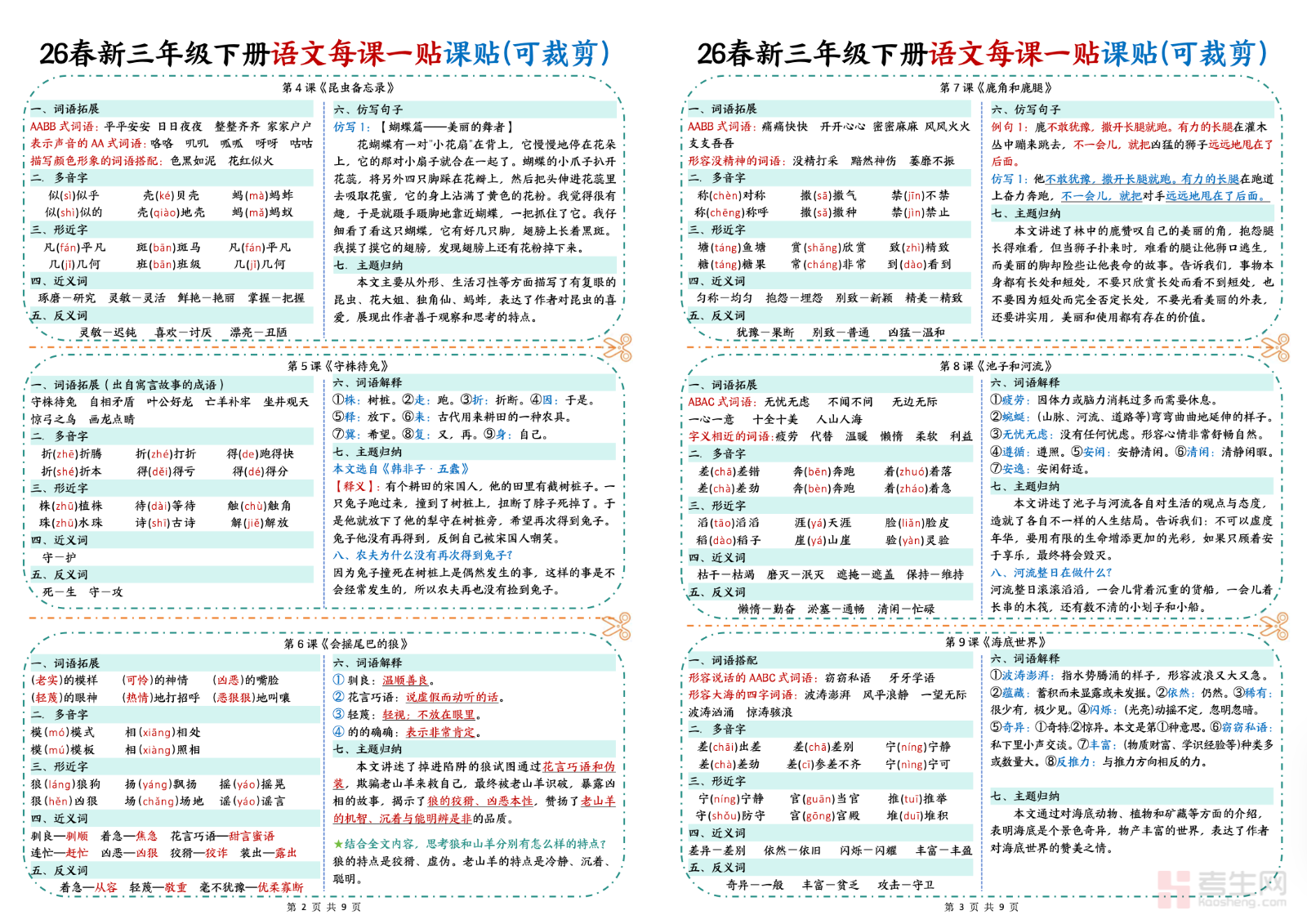 26 春小学语文彩色一课一贴(三年级下)同步部编版三年级下册课本内容,采用彩色标注排版,重点突出、直观易懂,适合小学中段语文基础巩固与考点梳理。资料按课文逐课整理,涵盖生字注音组词、近反义词积累、重点句段解析、课文中心归纳、必背内容标注、课内常考题型,将每课知识点系统化归纳,方便学生快速识记与复习。既能用于课前预习标记重点,也可作为课堂笔记补充与课后复习资料,帮助孩子扎实打好语文基础,提升阅读理解与应试答题能力,适配日常练习与单元考前复习。请添加微信 18617049513 进专属群,获取更多免费资源!