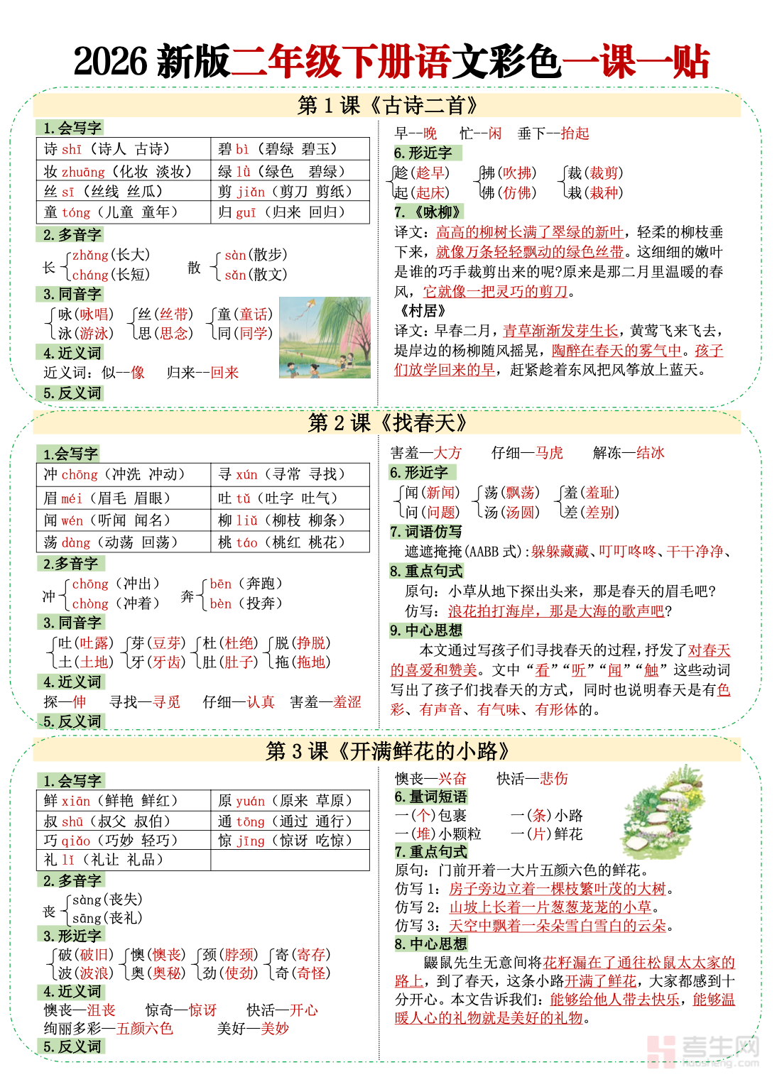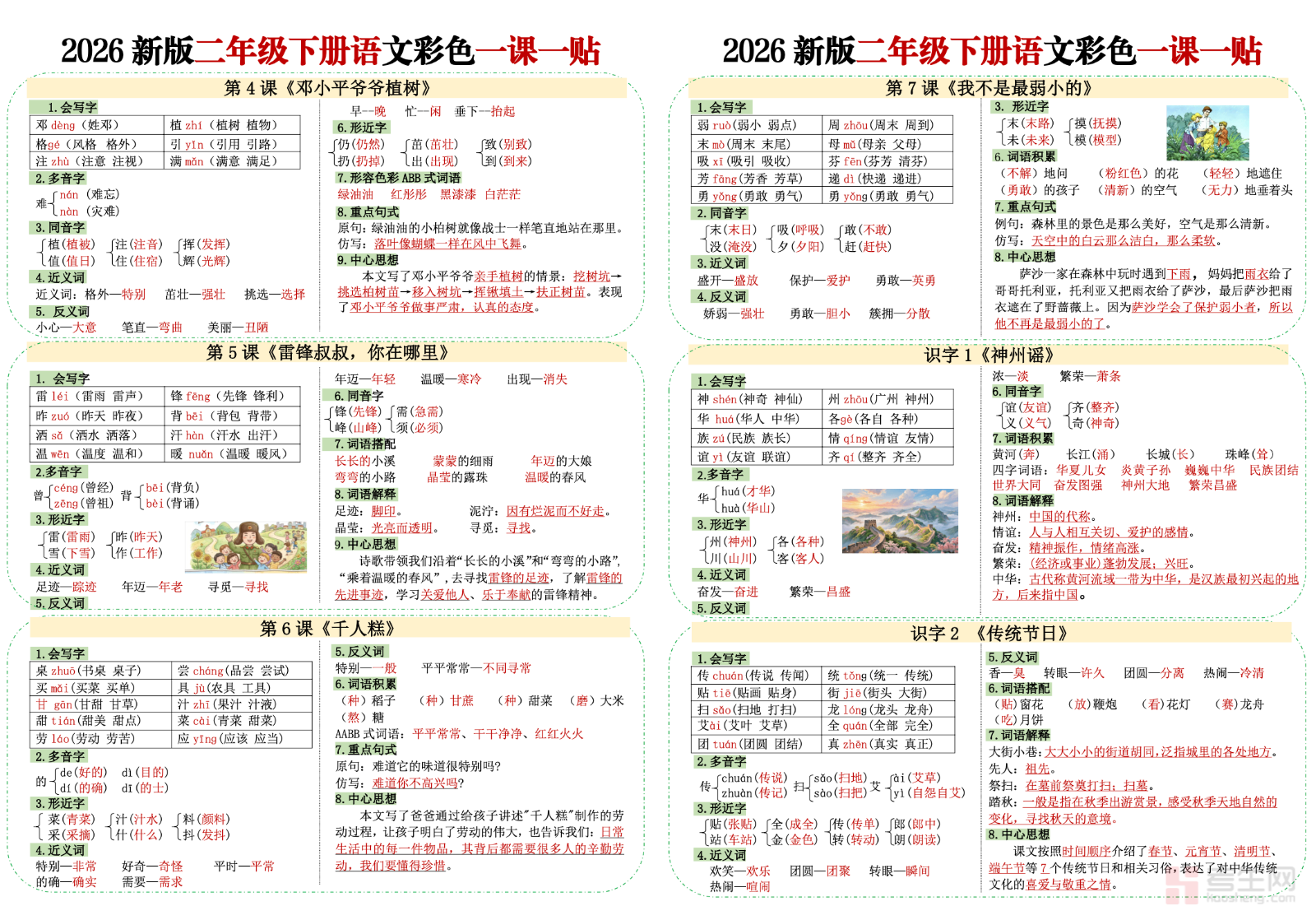 26 春小学语文彩色一课一贴(一年级下)同步部编版一年级下册课本内容,采用彩色醒目标注设计,重点清晰、形式活泼,适配低年级学生认知特点。资料按课文逐课归纳,涵盖拼音认读、生字笔顺、偏旁部首、组词造句、简单词语积累、课文重点句、必背儿歌与段落等基础知识点,提炼每课核心考点与易错内容,兼顾预习、课堂使用与课后复习。内容简洁易懂、实用性强,能帮助孩子快速掌握课内基础,夯实拼音与识字功底,提升语文学习兴趣与应试基础能力,适合日常巩固与单元小测复习使用。请添加微信 18617049513 进专属群,获取更多免费资源!