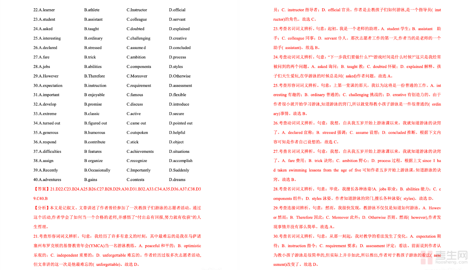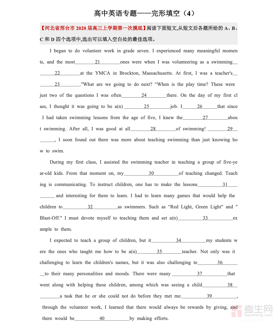 高中英语专题 —— 完形填空(4)聚焦高考英语完形填空核心考点与高阶解题技巧,针对逻辑连接词、固定搭配辨析、语境语义推断、情感态度判断、长句结构分析等高频难点进行专项突破。内容精选高考真题同源篇目,按记叙文、说明文、议论文分类训练,配套详细解析,重点讲解上下文呼应、词汇复现、语法结构、语篇逻辑四大解题思路。专题侧重易错题型强化与限时训练,帮助学生总结答题规律、提升语感与篇章理解能力,适合高二巩固提升、高三一轮二轮复习使用,高效攻克完形填空失分重灾区,稳步提高英语成绩。请添加微信 18617049513 进专属群,获取更多免费资源!