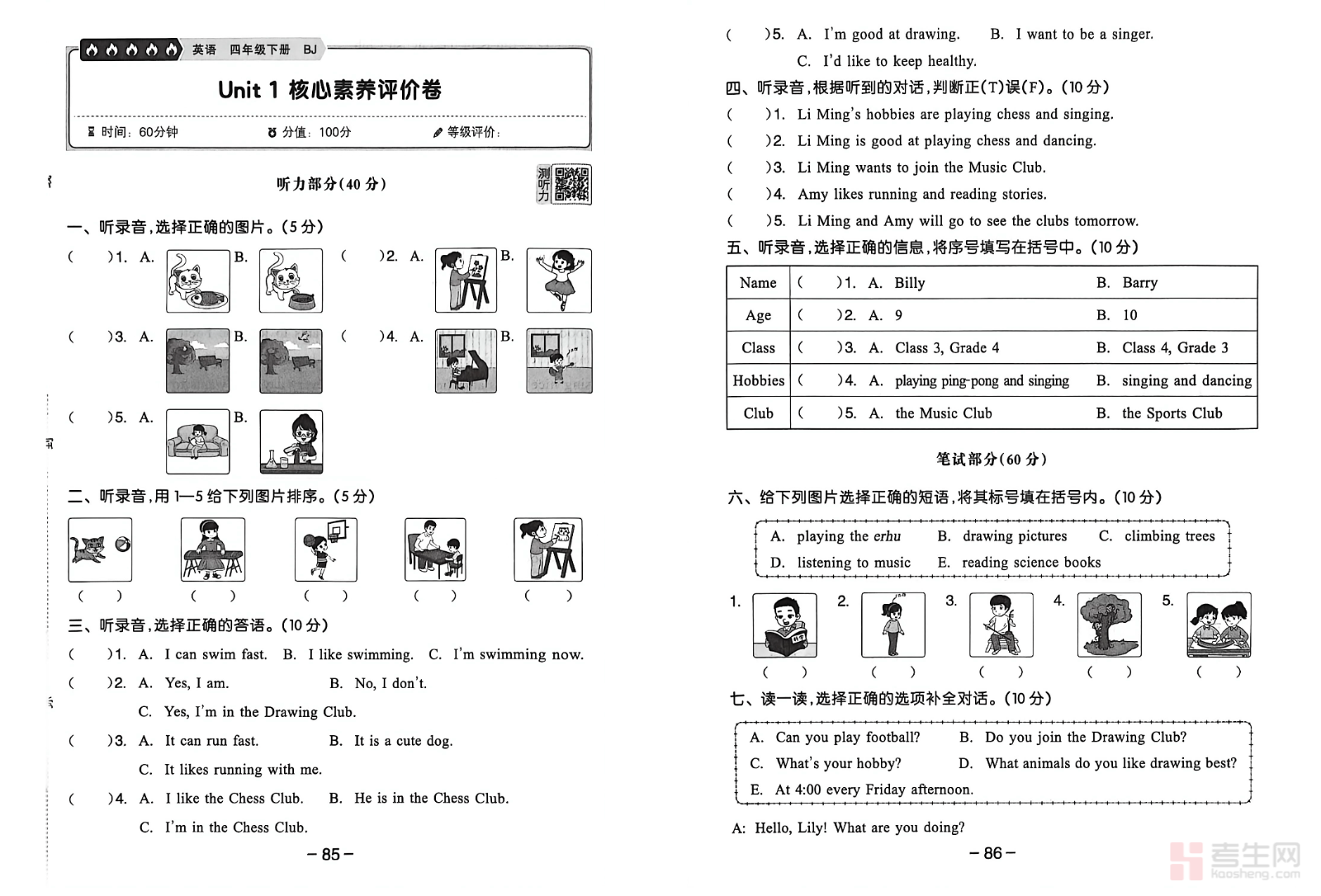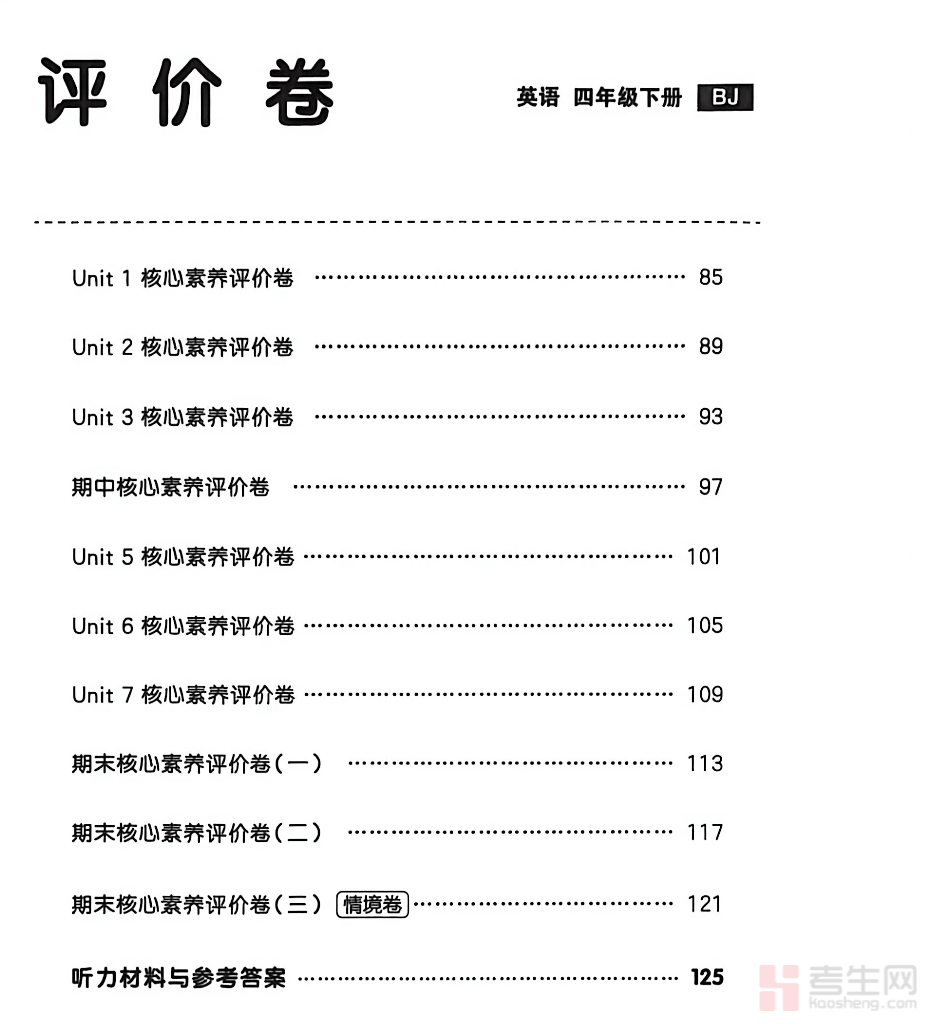 小学英语全品学练考评价卷(北京版)(四年级下)严格同步北京版四年级下册英语教材内容,贴合小学中段英语学习与校内测试要求,按单元科学编排,全面覆盖词汇认读、核心句型、基础语法、情景交际、听力理解、简单阅读理解等必考知识点。试卷题型丰富规范,难度贴合课堂教学进度,注重基础知识检测与语言运用能力考查,适合单元检测、阶段性复习与考前模拟使用。配套完整参考答案,方便学生自主订正、家长辅导检查,帮助孩子及时查漏补缺,巩固单元所学内容,提升英语应试能力与学习效果。请添加微信 18617049513 进专属群,获取更多免费资源!