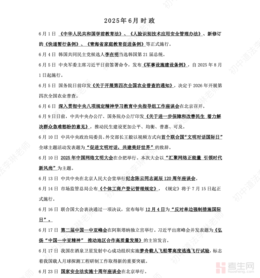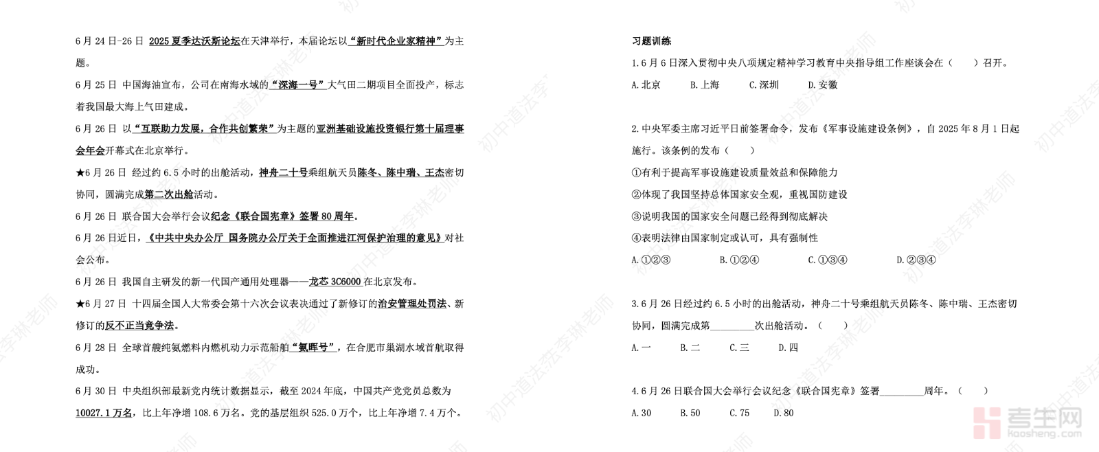 初中道法 2025 年 6 月 - 2026 年 3 月时政(共 99 页)精准覆盖中考道法核心时政周期,完整收录近 10 个月国内重大会议、科技创新成就、法治建设进展、民生保障政策、生态文明动态、国际热点等高频考点素材。资料按时间线 + 专题双维度整理,清晰标注热点事件、核心内容、教材考点链接、命题角度,全面贴合政治认同、法治观念、道德修养等中考考查要求。内容详实系统,共 99 页大容量素材,适配一轮基础识记、二轮专题突破、考前冲刺押题全阶段复习,帮助学生快速掌握时政答题术语、材料分析技巧、主观题得分要点,高效提升道法应试能力。请添加微信 18617049513 进专属群,获取更多免费资源!