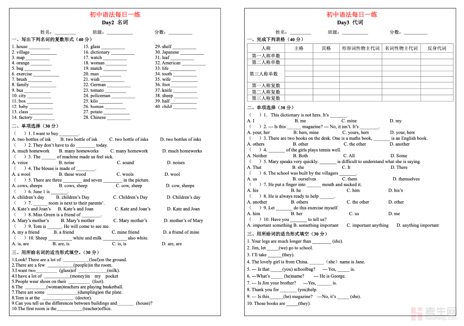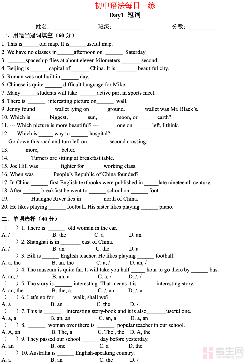 初中英语语法每日一练紧扣初中英语语法体系与中考高频考点,按天规划练习内容,覆盖时态语态、非谓语动词、三大从句、介词连词、主谓一致、形容词副词等核心语法模块。每日习题由易到难梯度设计,包含单选、填空、句型转换等经典题型,注重基础巩固、易错点突破、答题技巧训练。每道题目配套详细解析,清晰点明语法规则与解题思路,方便学生及时订正总结。资料适合日常碎片化练习、课堂巩固及考前系统刷题,帮助学生循序渐进掌握语法知识,提升做题准确率与英语综合应试能力。请添加微信 18617049513 进专属群,获取更多免费资源!