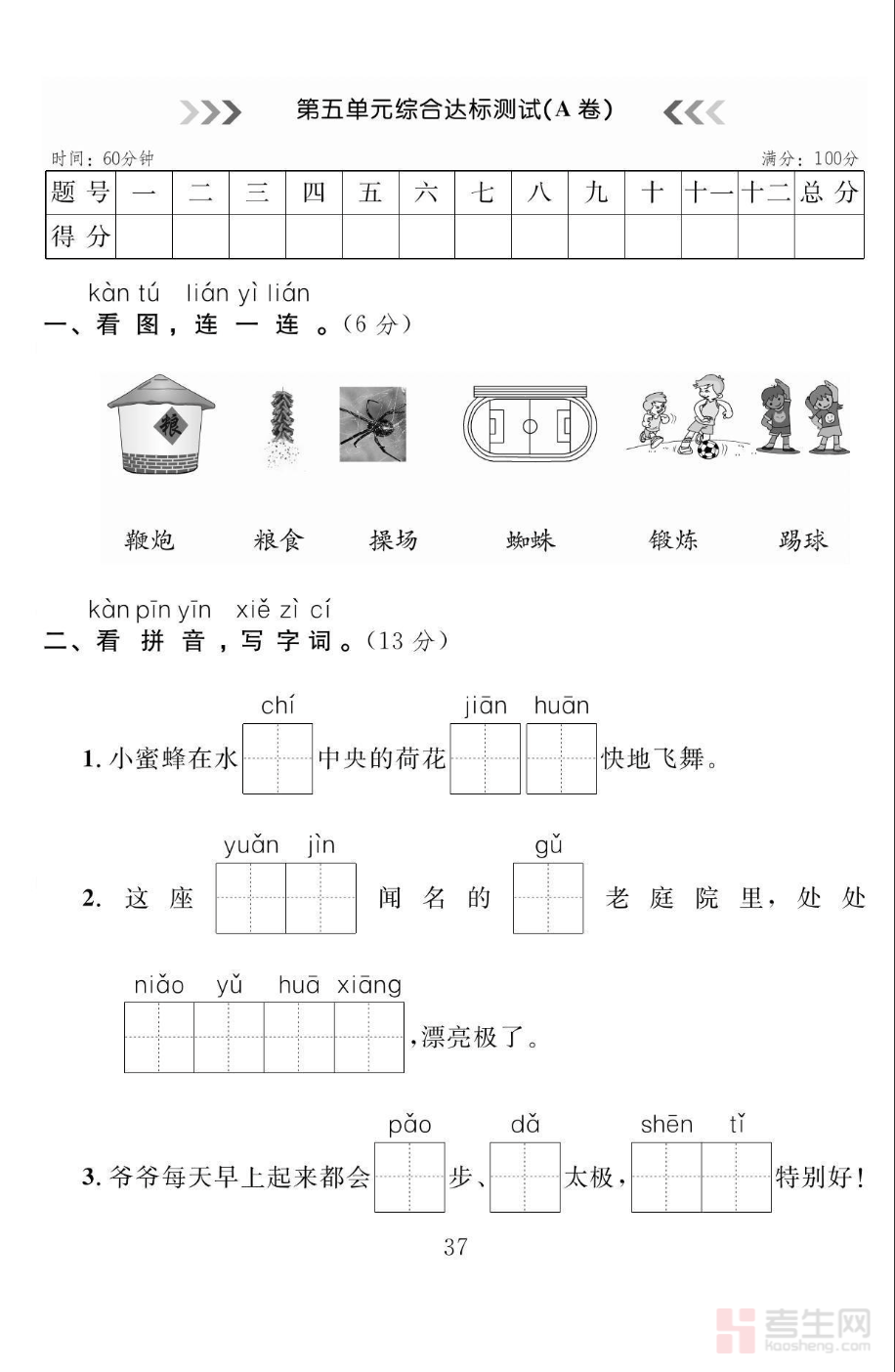 小学语文第五单元测试卷(一年级下)严格同步部编版一年级下册语文第五单元教学内容,围绕单元核心知识点设计,全面考查拼音运用、生字书写、词语积累、反义词辨析、句子仿写、课内阅读与看图表达等基础能力。题型贴合校内常规检测形式,包含看拼音写词语、选字填空、连词成句、课文内容填空、简单阅读理解等,题量适中、难度梯度合理,符合低年级学生认知特点。试卷既可用于单元结束后的学情检测,也可作为课后巩固练习与家庭自测卷,帮助孩子及时巩固课堂知识,找出薄弱环节,扎实打好低年级语文基础,提升识字与阅读基本功。请添加微信 18617049513 进专属群,获取更多免费资源!