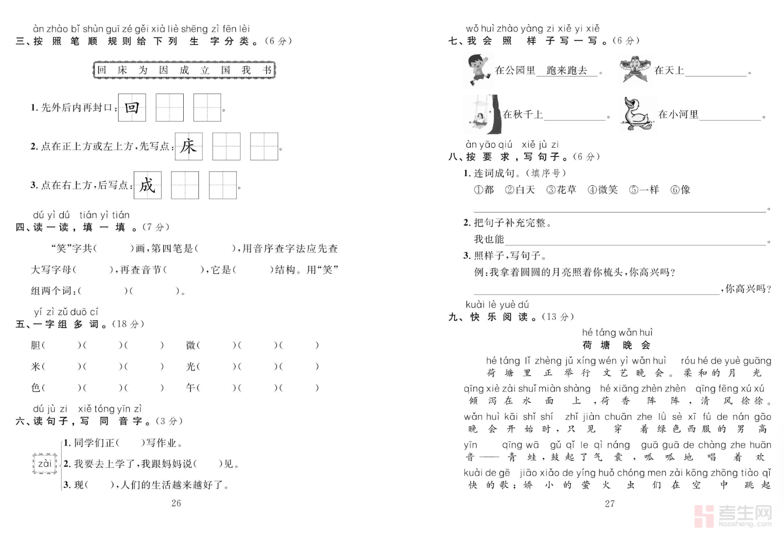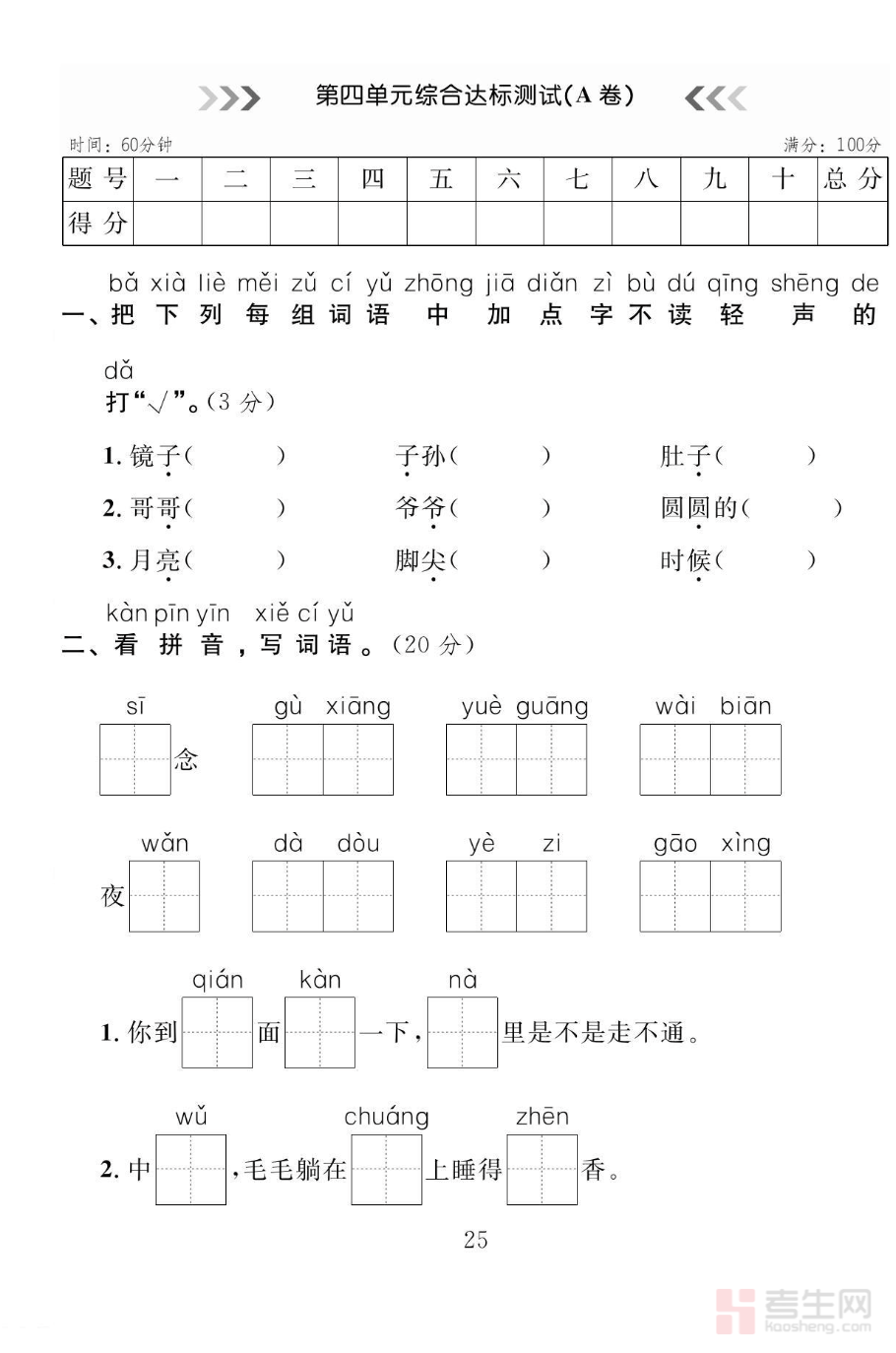 小学语文第四单元测试卷(一年级下)同步部编版一年级下册语文第四单元教学内容,紧扣低年级语文基础考查要点,全面覆盖生字认读与书写、拼音拼读、词语积累、近反义词、课文背诵、简单句子运用及课内阅读理解等核心知识点。题型设计贴合一年级认知水平,包含看拼音写词语、形近字辨析、照样子写句子、课文内容填空、片段阅读等常规题型,题量适中、难度循序渐进,符合校内单元检测标准。试卷排版清晰,适合单元复习检测、课后巩固练习与家庭自测使用,能有效检验孩子知识掌握情况,及时查漏补缺,夯实语文基础,提升识字、阅读与基础表达能力。请添加微信 18617049513 进专属群,获取更多免费资源!