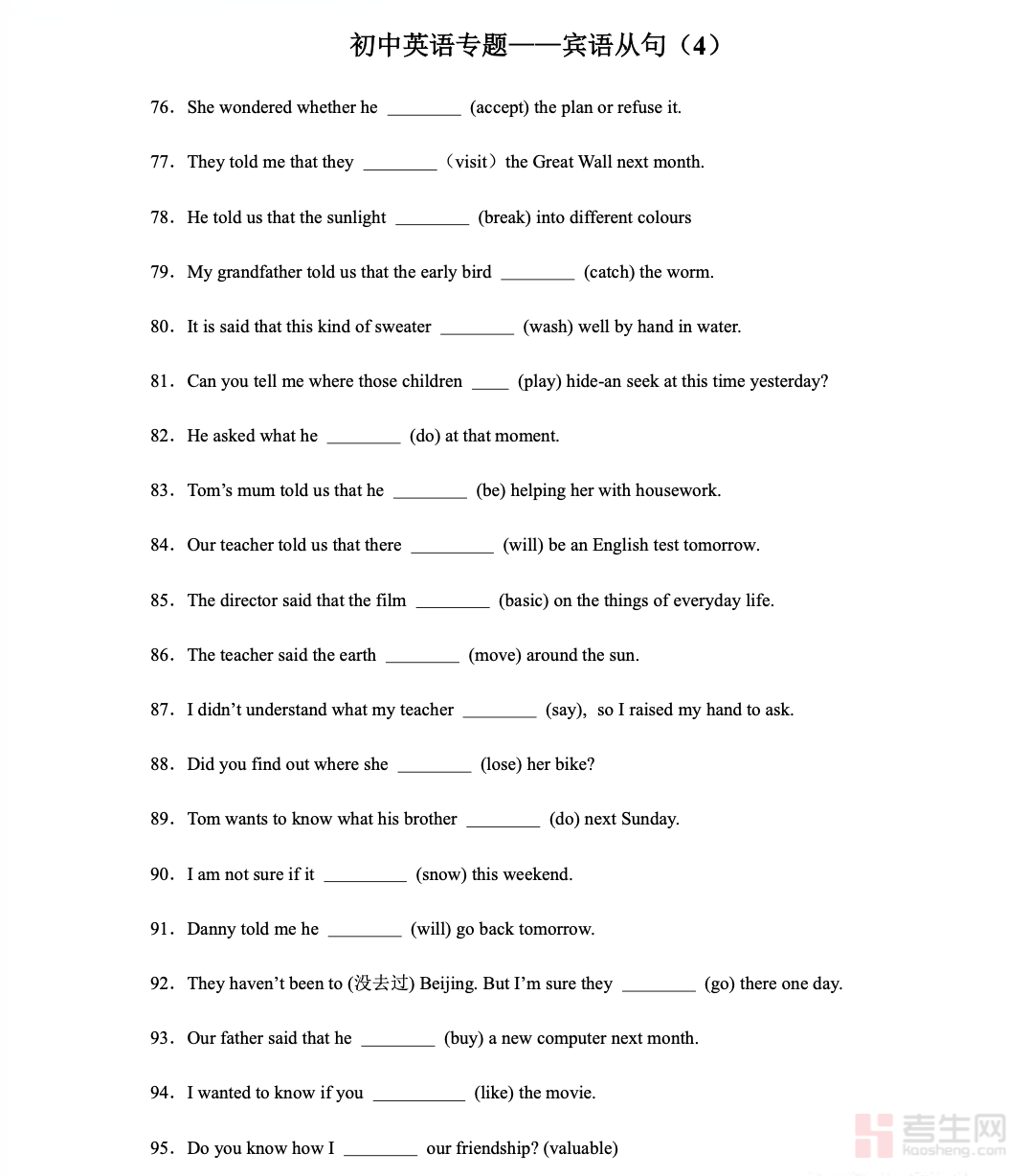 初中英语专题 —— 宾语从句(4)聚焦初中英语核心语法考点,系统讲解宾语从句的基本概念、引导词用法、语序规则等基础知识点,重点剖析that/if/whether/ 特殊疑问词引导的从句结构,搭配典型例句与针对性习题,帮助学生理清解题思路。内容由浅入深,贴合中考命题趋势,着重强化语序判断、时态呼应、引导词选择三大核心能力,有效解决句式混淆、语法出错等问题。适合初中各年级学生语法专项学习、课堂巩固、错题突破、考前复习,快速掌握宾语从句核心用法,提升英语语法应试水平。请添加微信 18617049513 进专属群,获取更多免费资源!