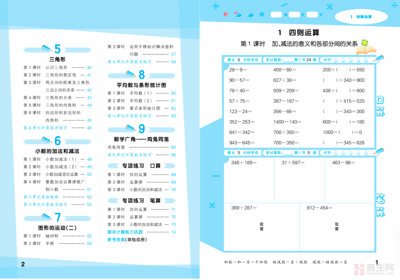 小学数学口算大通关(人教版)(四年级下)同步人教版四年级下册数学教材,全面覆盖四则运算、运算定律、小数的意义和性质、小数的加减法、三角形、平均数与条形统计图等核心计算内容,题型以基础口算、速算、简算为主,梯度清晰、题量适中,重点强化计算速度、准确率、简便运算、数感培养,贴合四年级计算能力提升要求。资料适合每日练习、课前预热、课后巩固与家庭自测,帮助学生夯实计算基本功,减少粗心失分,为数学进阶学习和应试提供扎实保障。请添加微信 18617049513 进专属群,获取更多免费资源!