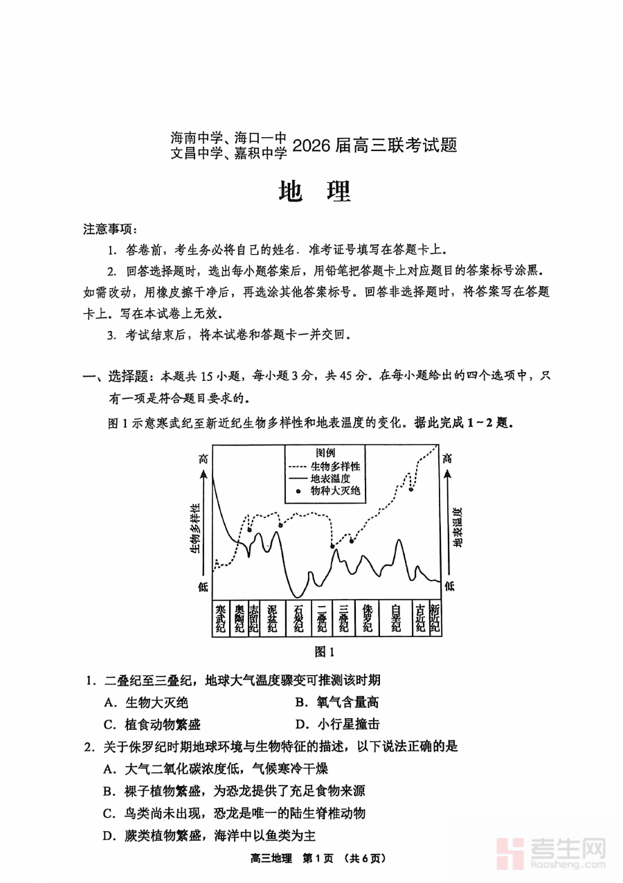 此试卷适用于海南省2026届高三学生,尤其是参与此次联考的四所学校学生,以及希望借助优质联考资源优化备考规划的高三地理学习者。作为阶段性检测工具,它能帮助学生查漏补缺,增强备考针对性与有效性,助力学生在后续复习中更高效地提升学科能力。