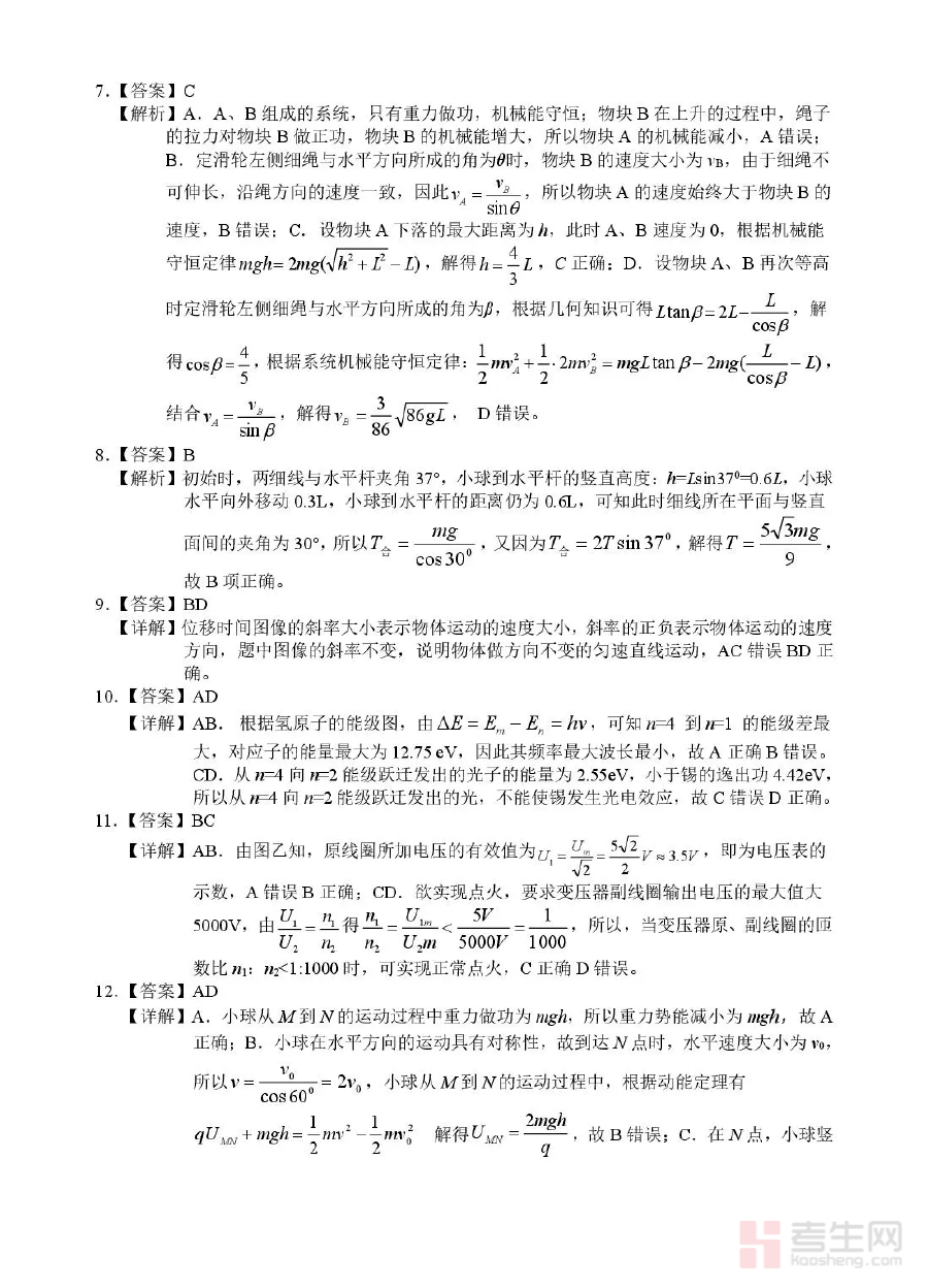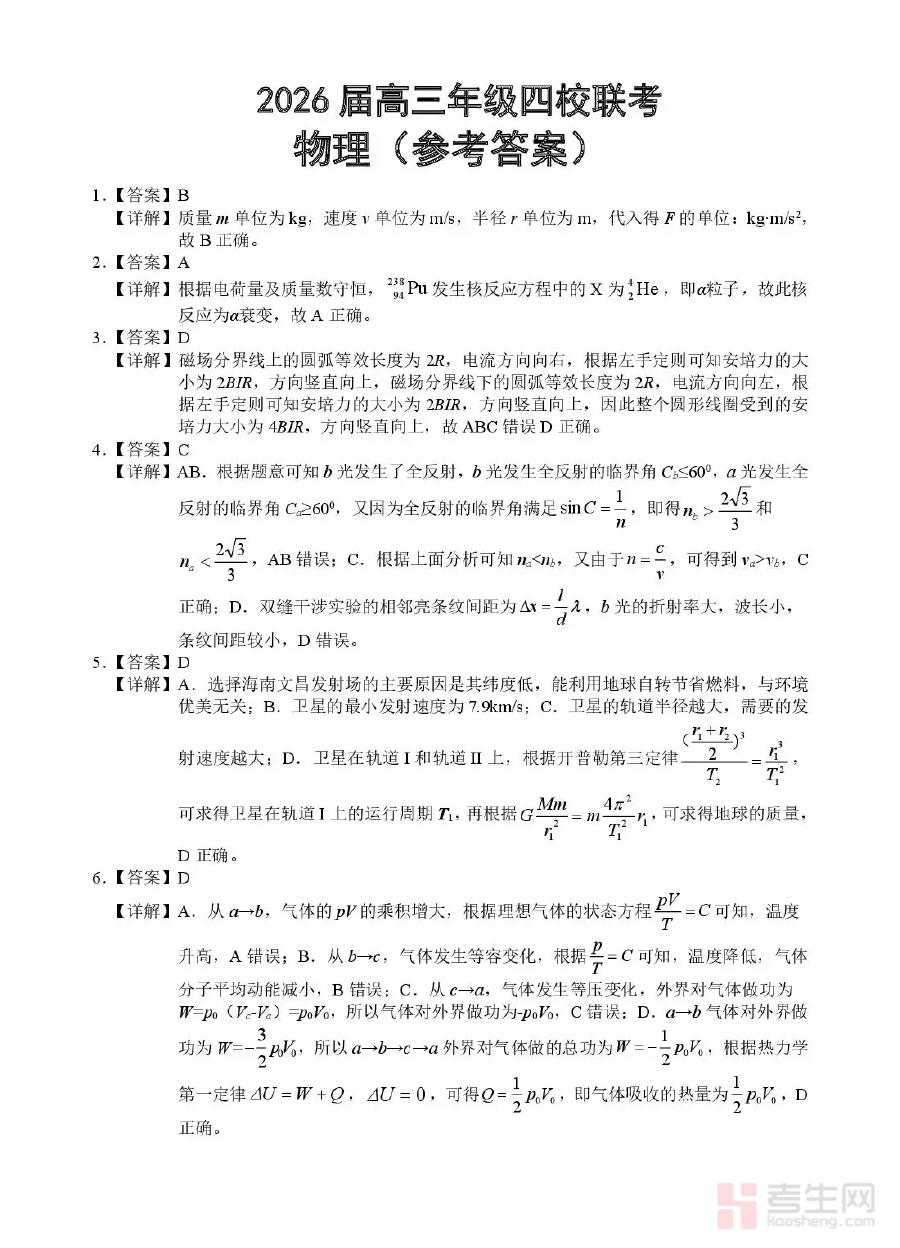 该资料可助力考生完成联考物理科目的答题核对工作,及时识别自身在物理知识体系构建与解题应用能力方面的不足,为后续个性化备考规划提供精准依据,同时也能帮助教师掌握学生群体在该阶段的物理学习动态,优化教学与复习指导策略,提升整体备考效率。