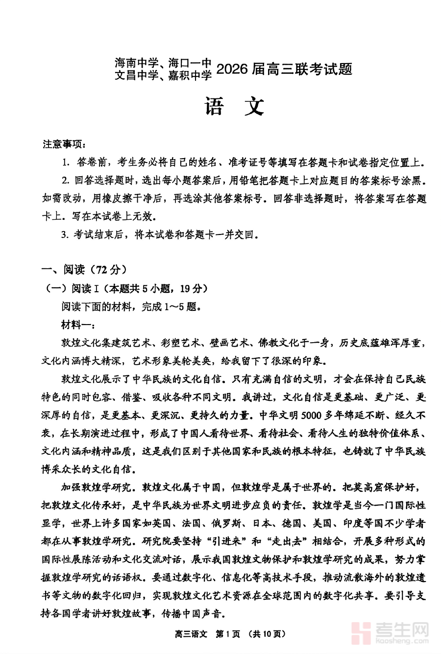 《(海南中学、海口一中、文昌中学、嘉积中学)2026届高三下学期3月联考 语文》是海南地区四所重点中学联合开展的2026届高三语文阶段性考试资料,聚焦高三下学期3月这一高考备考关键节点,贴合本地教学实际与考试趋势,为学生提供针对性的语文备考支持。