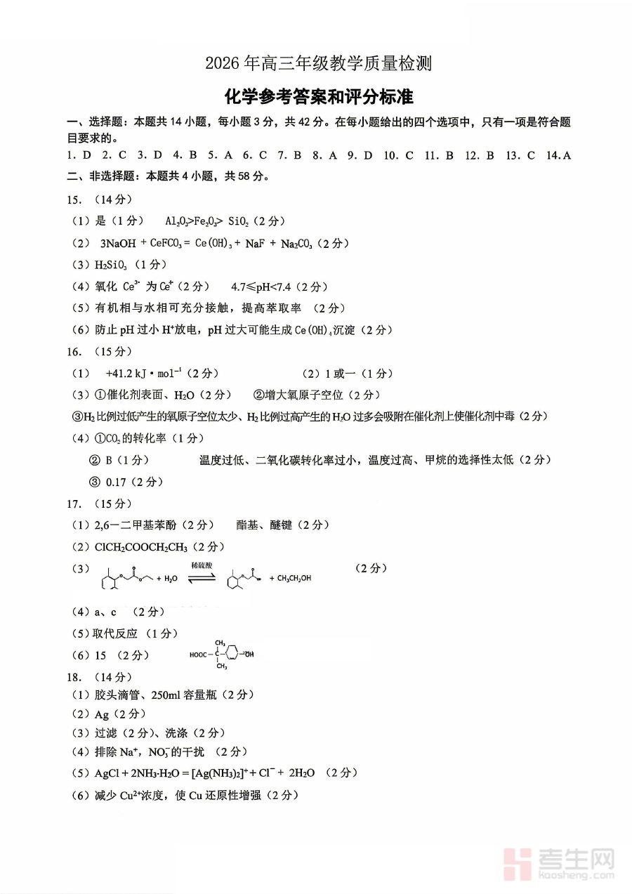 《银川市、石嘴山市、吴忠市三市2026年高三年级学科教学质量检测 化学答案》是2026年由银川、石嘴山、吴忠三市联合开展的高三年级化学学科教学质量检测的配套参考答案。该检测属于区域内高三阶段重要的教学质量评估活动,旨在通过统一测试掌握三市高三学生化学学科的学习进展与综合水平,而这份答案则为该检测提供了权威的评分标准与答题参考依据,是高三化学备考过程中的关键辅助资料。
