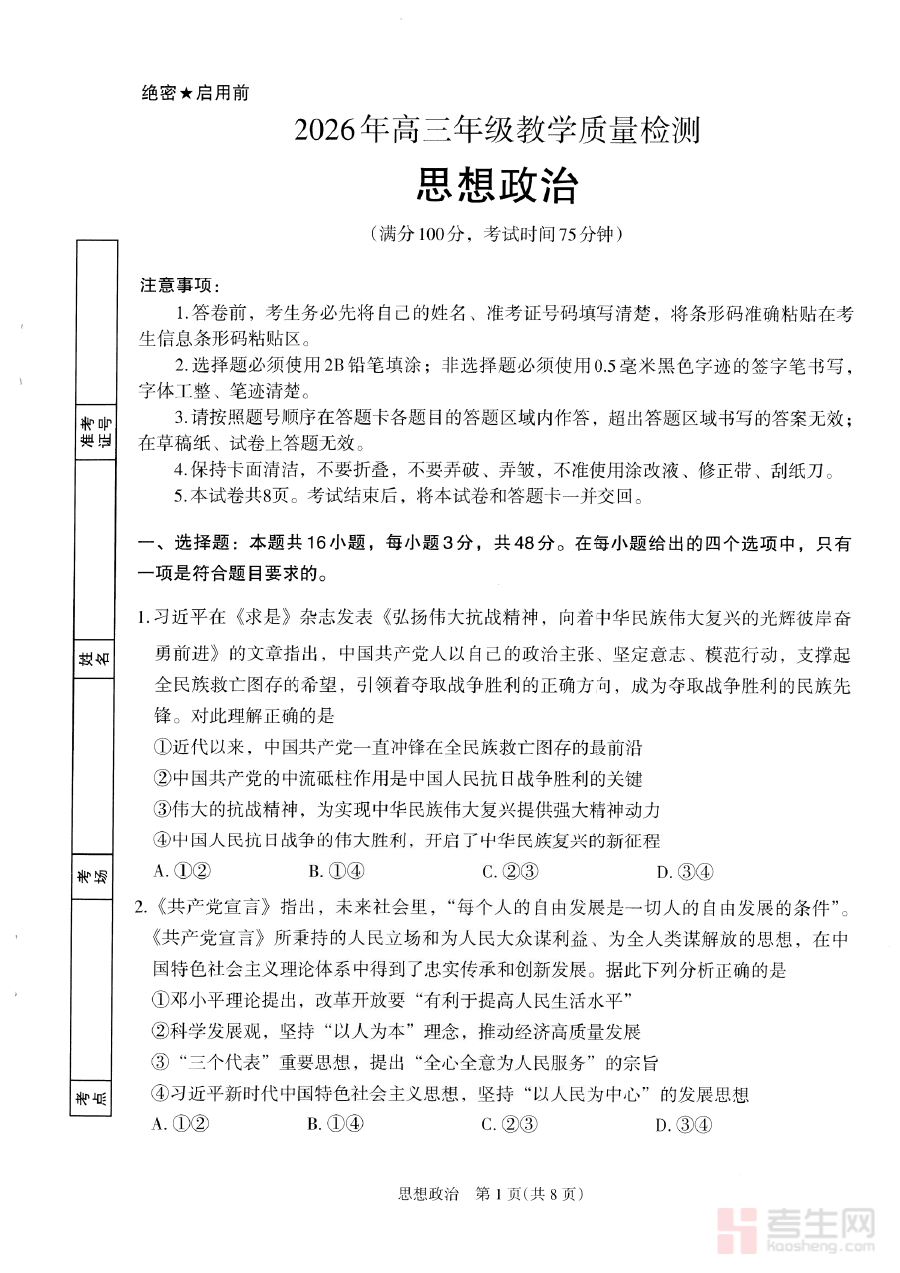 《银川市、石嘴山市、吴忠市三市2026年高三年级学科教学质量检测 政治》是2026年由银川、石嘴山、吴忠三市联合组织的高三政治学科教学质量检测相关备考资料,聚焦三市高三政治教学的阶段性评估需求,旨在为师生提供贴合区域教学实际的检测参考依据,能够有效反映三市高三学生政治学科的学习进展与整体水平。