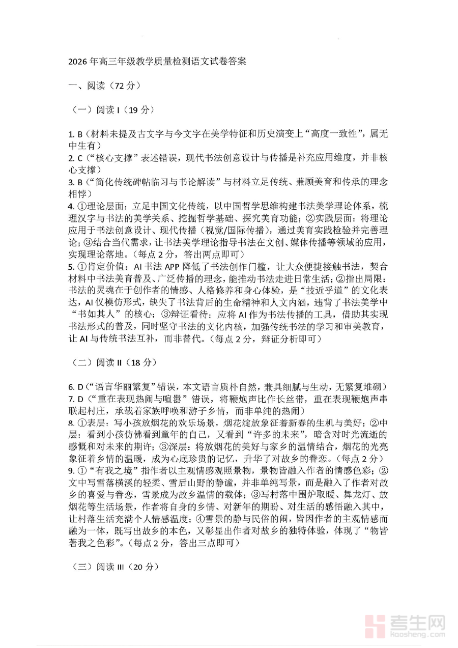 《银川市、石嘴山市、吴忠市三市2026年高三年级学科教学质量检测 语文答案》是2026年由银川、石嘴山、吴忠三市联合推出的高三语文教学质量检测配套资料,属于区域性高三阶段教学质量评估的官方参考文件,为当地高三语文教学与备考工作提供了权威的反馈依据。该资料紧密结合三市高三语文教学实际需求,是对高三学生语文学习成果进行阶段性评估的重要支撑材料。