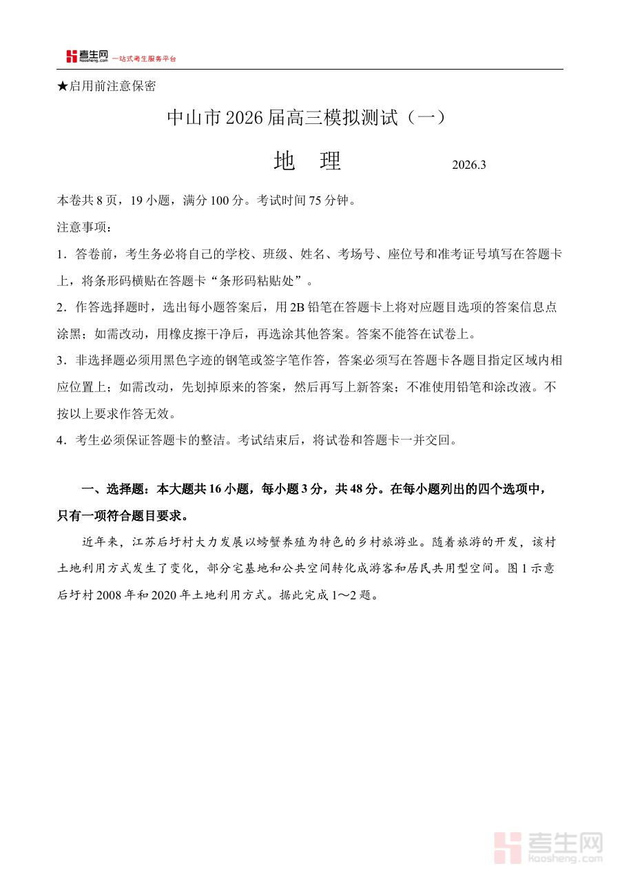 该资料主要适用于广东省中山市2026届高三地理学科师生群体,对于学生而言,通过完成试题并深入分析答案可及时发现知识漏洞,优化个人复习计划,提升备考效率;对于教师而言,可借助试题的考查维度与内容导向,完善教学方案与备考安排,进一步提升教学与备考的针对性和实效性,共同推动高三地理复习质量的稳步提升。
