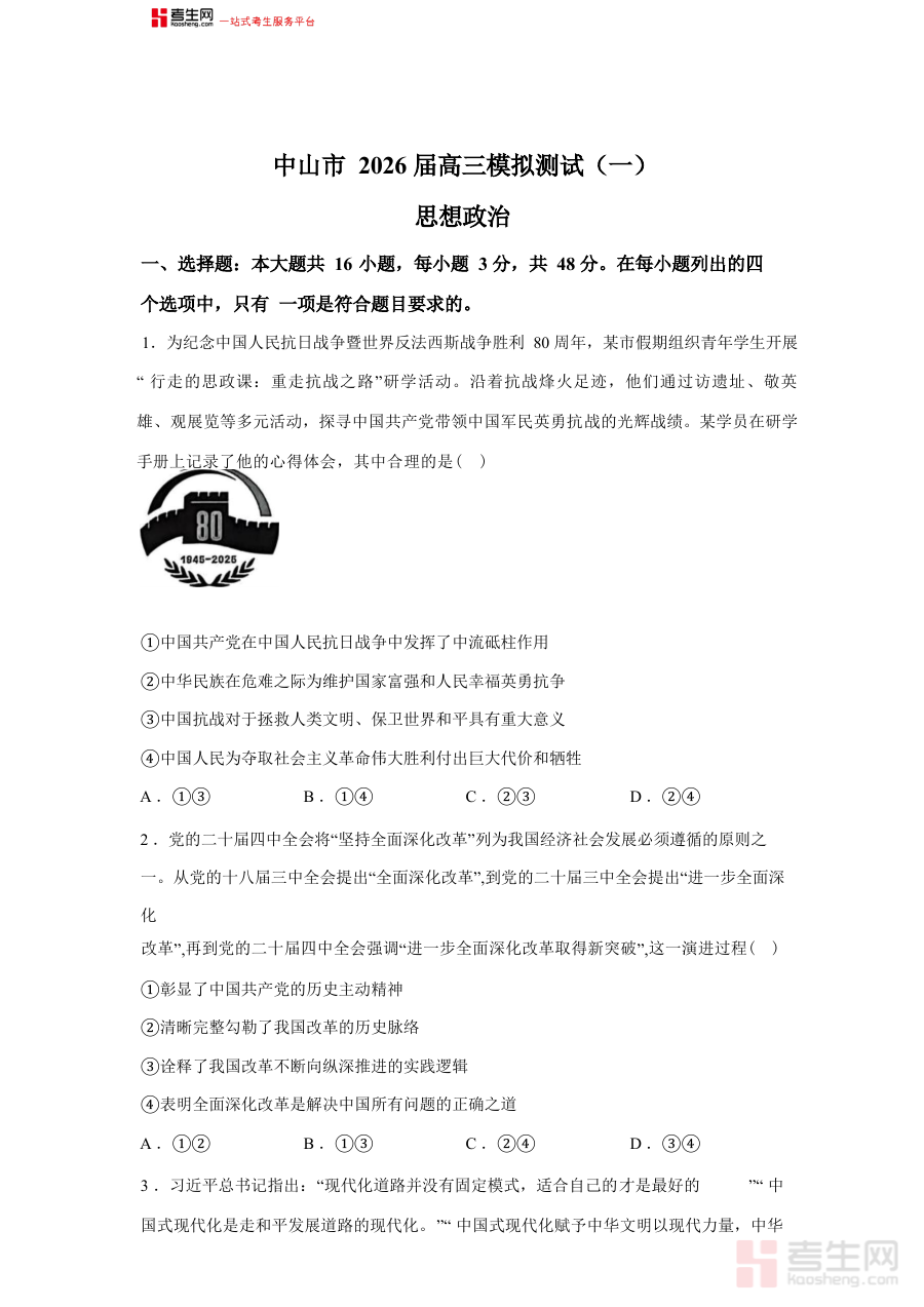 《广东省中山市2026届下学期高三一模 政治试题(含答案)》是针对广东省中山市2026届高三学生在第二学期开展的第一次模拟考试的政治学科备考资料。该资料结合当地高三教学进度与高考备考需求设计,包含完整的试题内容及配套参考答案,为师生提供贴合区域考试特点的阶段性复习参考依据。