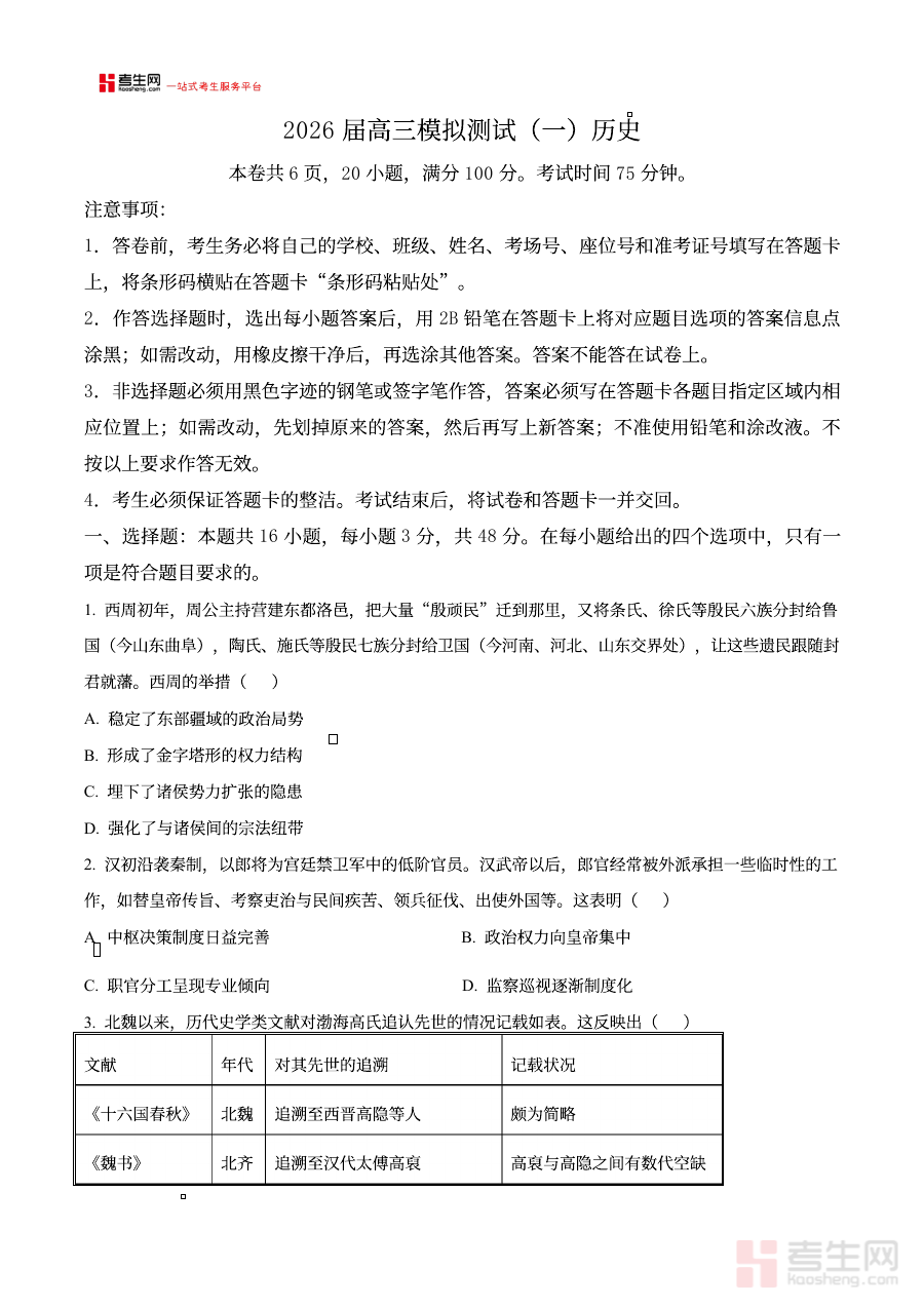 该资料适用于2026届广东中山市高三历史学科的师生群体。对于学生而言,借助原卷版试题可提前熟悉本地一模考试的形式、结构与命题风格,增强应试适应性与信心;对于教师而言,能通过该资料了解本地模拟考试的命题导向,更好地指导学生进行系统性复习,推动学生历史学科核心素养的提升与应试能力的强化。