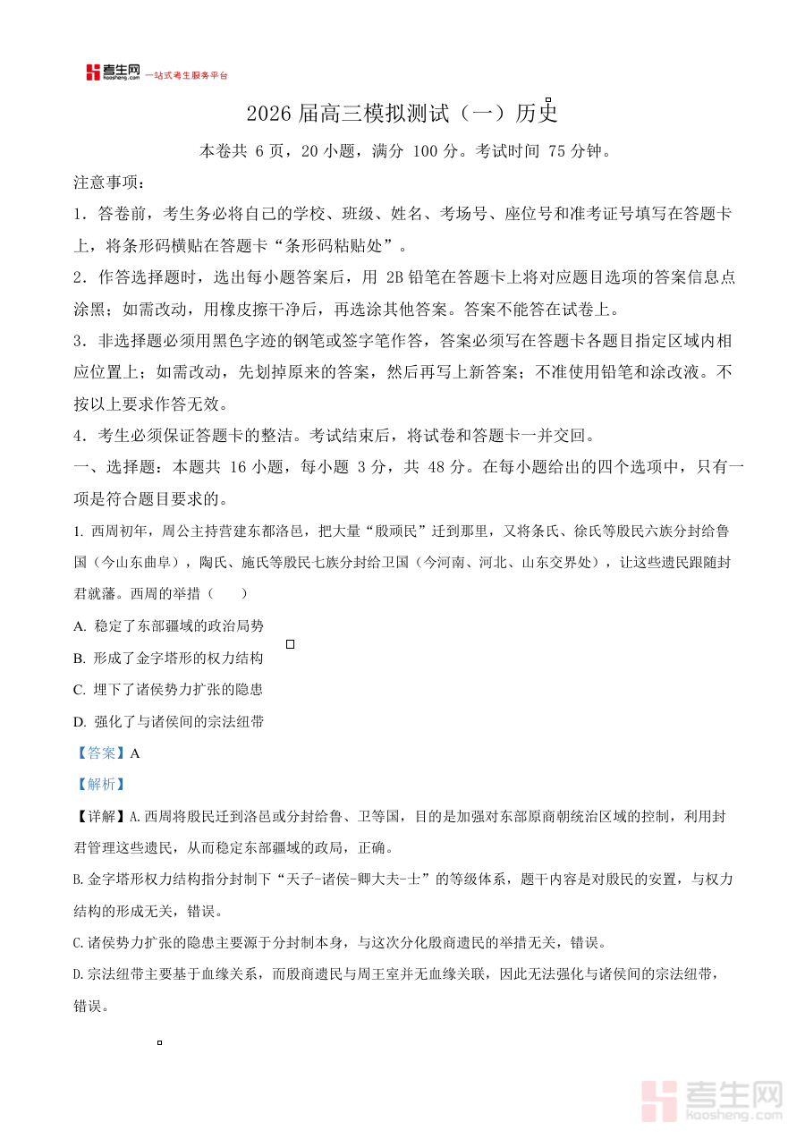 该解析版资料可有效用于高三学生的学情诊断工作,帮助他们清晰认知自身在历史知识体系构建、解题方法运用及答题规范掌握等方面的优势与不足;同时可为教师提供阶段教学效果的评估依据,辅助教师调整后续备考计划与教学策略,增强教学的精准性与针对性;此外还能作为学生自主复习的核心资源,通过解析内容明确考点分布逻辑与答题思路要点。