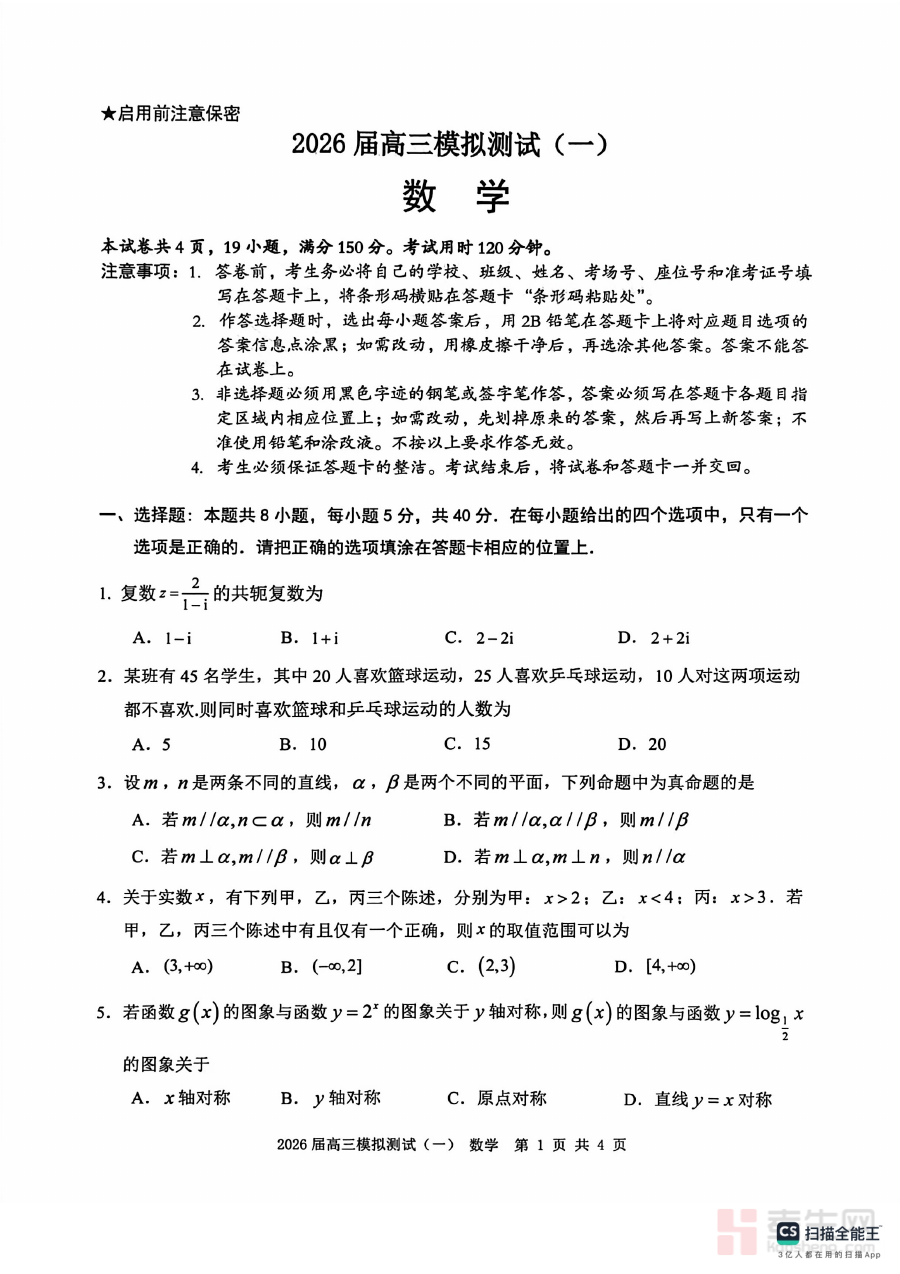 《广东中山联考2026届高三模拟测试(一)数学试题》是面向广东省中山市2026届高三学生的区域性联合模拟考试数学科目备考资料,依托当地教育部门及学校联合命题机制,贴合高三初期复习进度与联考命题导向,为该阶段数学学习提供标准化的阶段性检测支撑。
