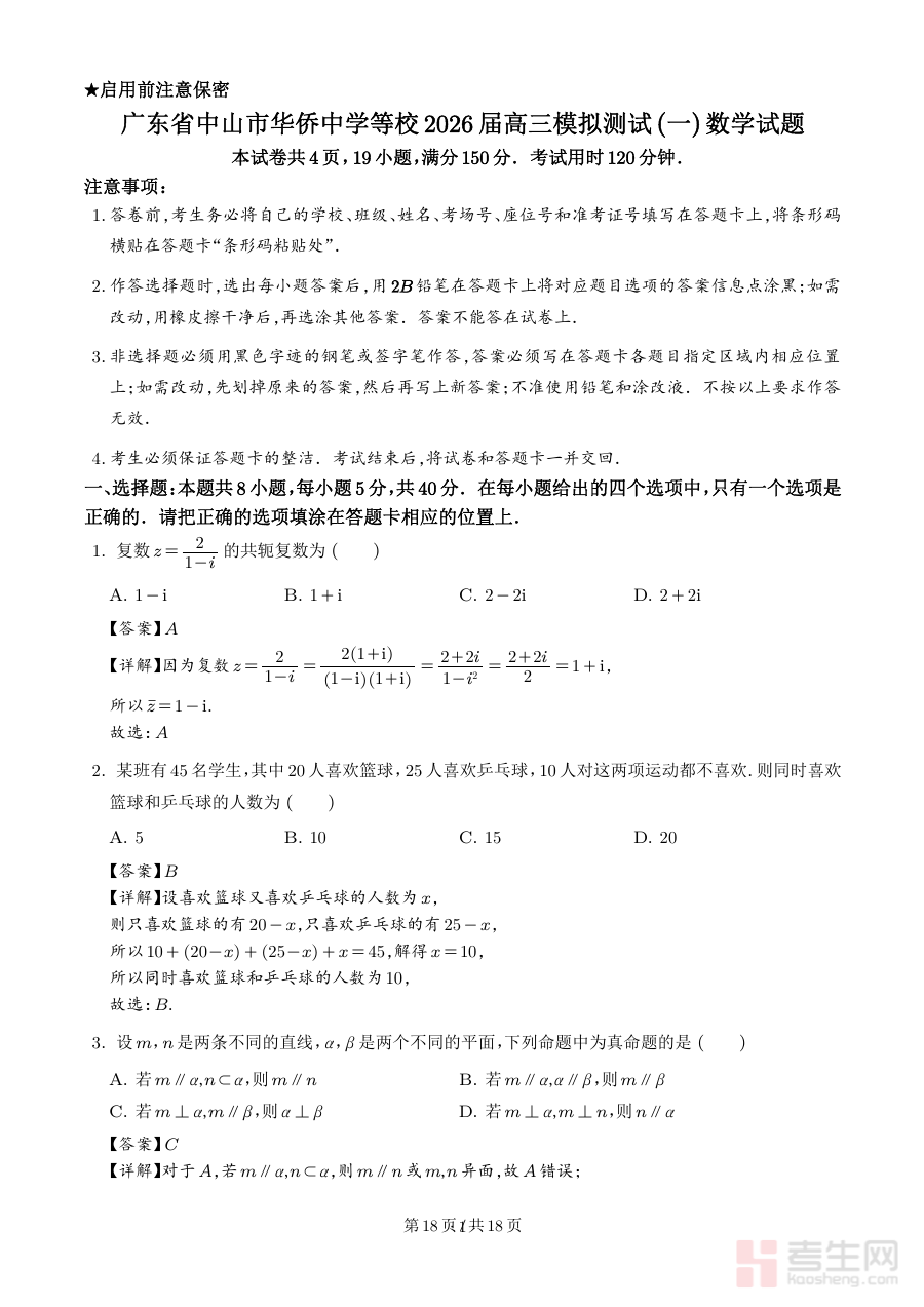 《广东省中山市华侨中学等校2026届高三模拟测试(一)数学试题(解析版)》是面向广东省中山市华侨中学及参与联考学校2026届高三学生的数学学科模拟测试资料,属于高三阶段首轮模拟考试范畴,旨在为相关学校和学生提供贴合本地教学实际的备考支持。